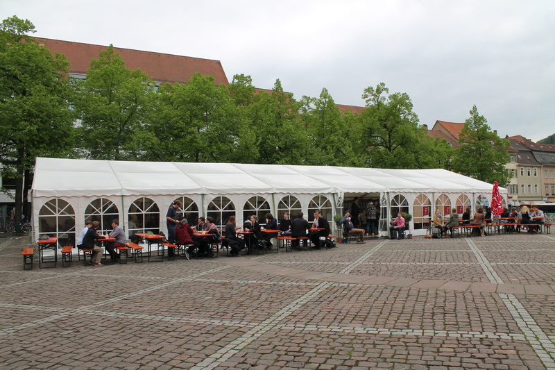 Während der Veranstaltung selbst sind die Organisatoren pausenlos eingespannt. Sie kommen frühmorgens und gehen erst am späten Abend. Zeit für ein verdientes Feierabendbier muss trotzdem sein. Der Lohn der harten Arbeit ist dann ein erfolgreiches Event: „Während des Symposiums selbst war es entspannter als erwartet – es hat alles gut funktioniert“, so Leander Beinlichs Fazit. Aber noch ist es nicht so weit, entspannt auf eine gelungene Veranstaltung zurückblicken zu können. Auf dem verregneten Uniplatz müssen zunächst die Lebensmittel und Stühle abgedeckt werden. Unter den Planen stauen sich Stühle, Marmeladegläser, Kartons voller Getränke und Blumen zur Dekoration. Das Zelt, die größte und wichtigste Sachspende, ist eingetroffen und wird unter Anleitung und Mithilfe der Verleiher aufgebaut. Und auch wenn sie nicht groß in den Mai reinfeiern können, an diesem Abend, nach dem Zeltaufbau lassen sie es sich nicht nehmen, zumindest ein bisschen auszuspannen. Noch ein Tag, dann kann das Symposium beginnen.