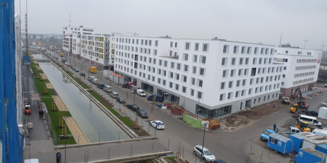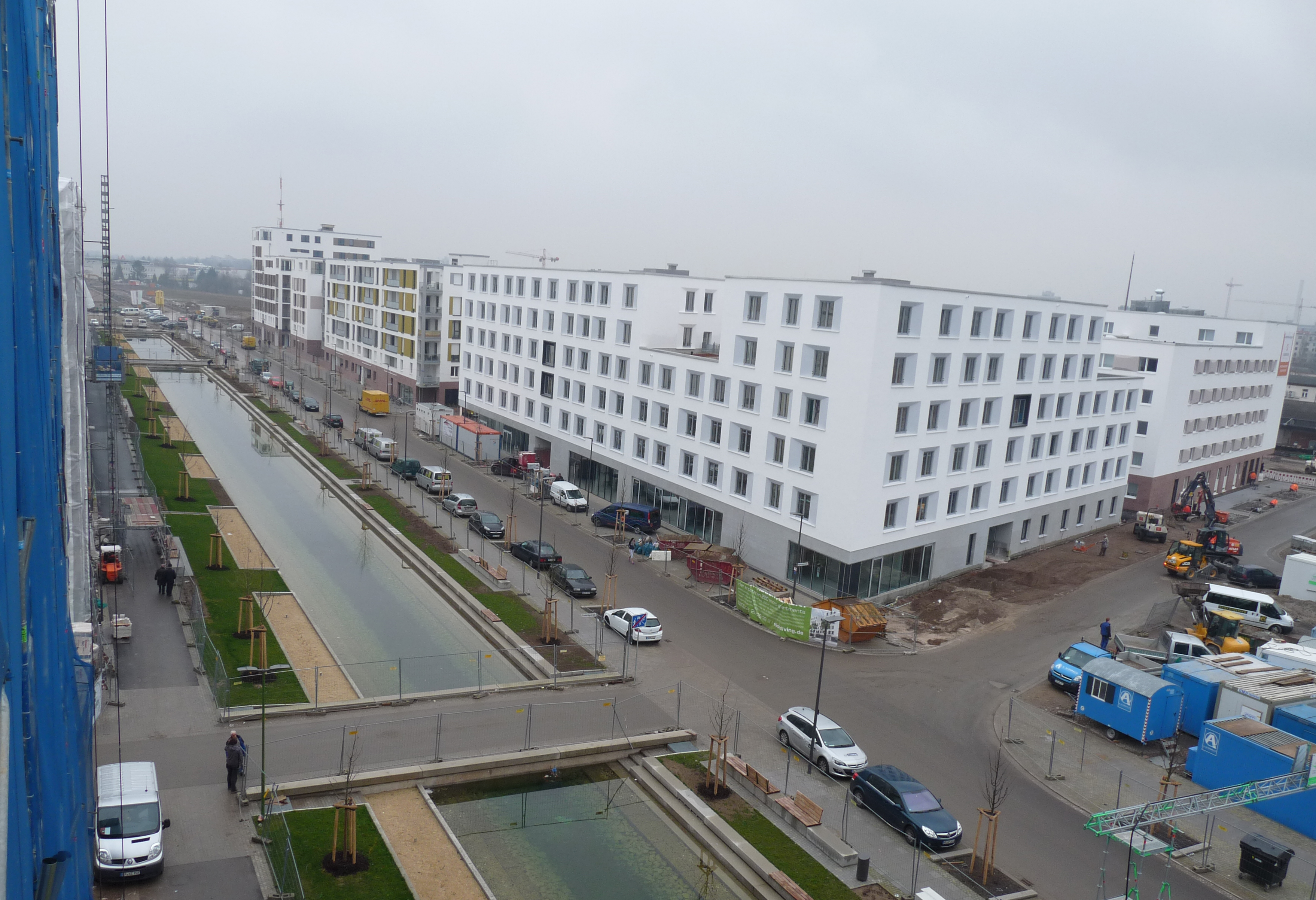 Wie plant man einen Stadtteil? Erstmal zwei sich kreuzende Straßen, die Kreuzung soll das Stadtzentrum sein. So machten es die Römer und eigentlich alle nach ihnen. Genau so geschah es auch in der Bahnstadt, dort sind die Straßen Langer Anger und die Max-Jareckie-Straße die Hauptstraßen. An der Kreuzung dieser Straßen, im Zentrum des Stadtteils, ist ein Kinderhort. Dies passt zu den Prioritäten in der Bahnstadt, denn vor allem Familien sollen hier leben und arbeiten. An den anderen Ecken der Kreuzung sind die Flächen noch nicht bebaut.