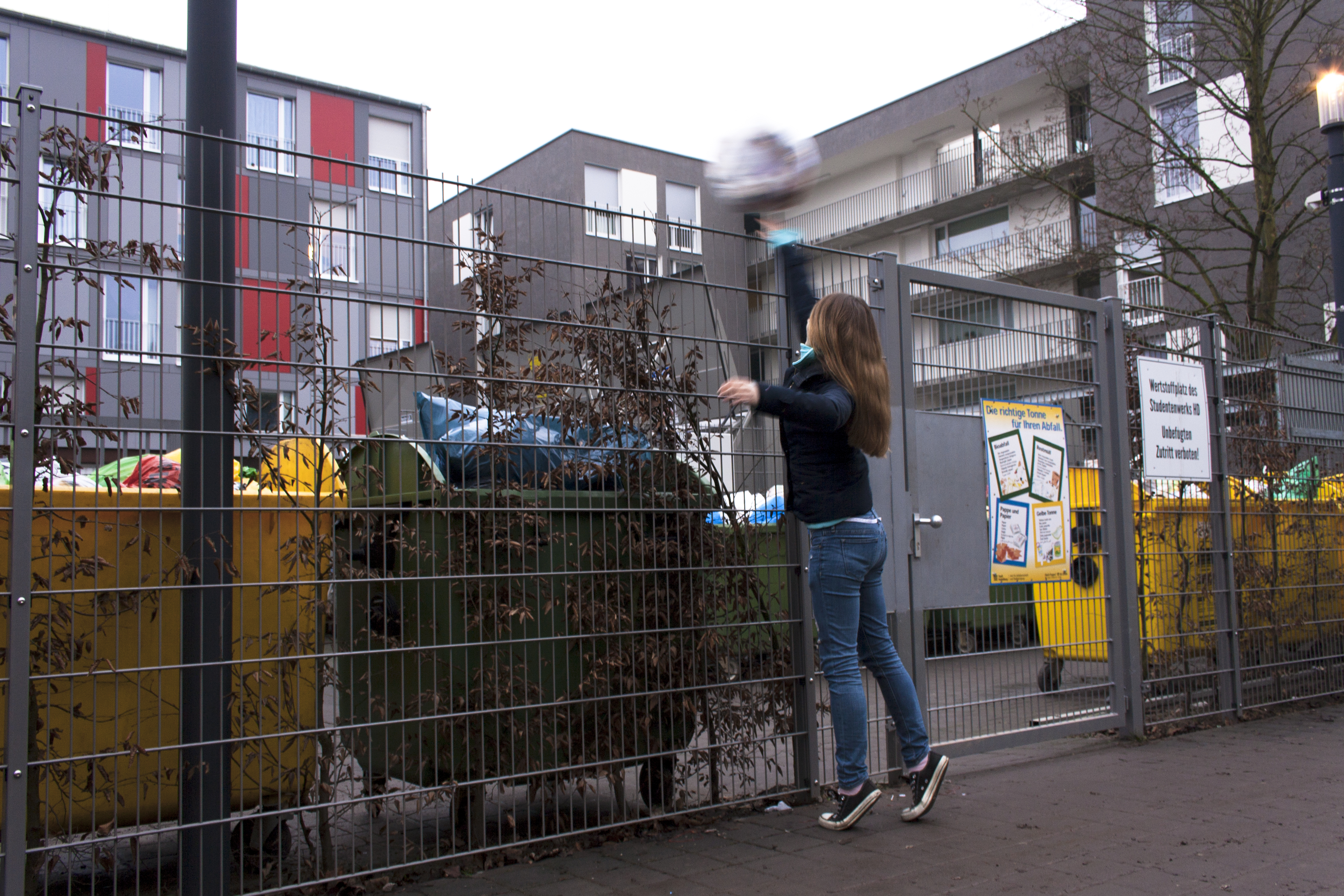In Siedlungen wie dem Neuenheimer Feld leben Studenten in einer Art Parallelwelt mit eigenen Regeln, Reizen und Ritualen. Um beispielsweise den Müllplatz zu betreten, ist eine Schlüsselkarte nötig, die man gegen Kaution und Bescheinigung über den Wohnsitz beim Hausmeister erhält. Dies soll verhindern, dass Externe die Anlage nutzen. In der Tat ist die Müllhalde seither ein viel reinlicherer und angenehmerer Aufenthaltsort geworden. Zumal das Zielen beim Mülltüten-über-den-Zaun-werfen, wenn man seine Karte vergessen hat, immer besser klappt. Übung macht den Meister: Der gewissenhafte Student bringt seinen Müll mehrmals pro Woche zu den großen Tonnen, denn das Lagern von Müll vor den Wohnungstüren ist aus Brandschutzgründen verboten.