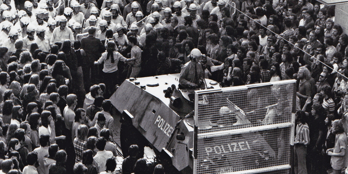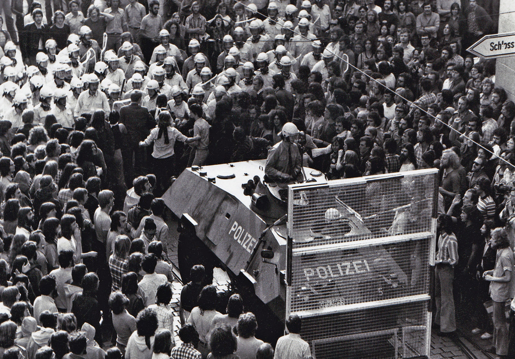Zwei gepanzerte Sonderfahrzeuge der Polizei fahren die besetzte Hauptstraße entlang. Hinter aus Mülltonnen und Sperrmüll errichteten Blockaden verschanzen sich mehrere tausend Demonstranten. Sie werfen Steine, Flaschen und Eisenstangen. Die aus dem ganzen Land herbeigerufenen Polizisten reagieren mit Tränengasbomben und Schlagstockeinsatz. „Bürgerkriegsähnliche Zustände in der Innenstadt“ titelt die Rhein-Neckar-Zeitung am Morgen danach; Oberbürgermeister Zundel fordert alle Bürger auf, sich von dem „gebotenen Politrockertum“ fernzuhalten.