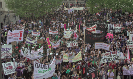 Mit 7000 Teilnehmern erlebte Halle im April 2013 die größte Demo seit der Wende, einen Monat später versammelten sich in Magdeburg sogar 9000 Menschen. Unterbrochen vom Hochwasser fanden landesweit weitere große Proteste statt. Beteiligt war keineswegs nur das linke Spektrum. Viele Hallenser sorgten sich um den Fortbestand der Uniklinik, Händler und regionale Wirtschaft legten auf Kaufkraft und fachlich gebildeten Nachwuchs wert, der Stadtrat verabschiedete mit allen Fraktionen eine Resolution. Auch die Rektoren redeten öffentlich Tacheles.