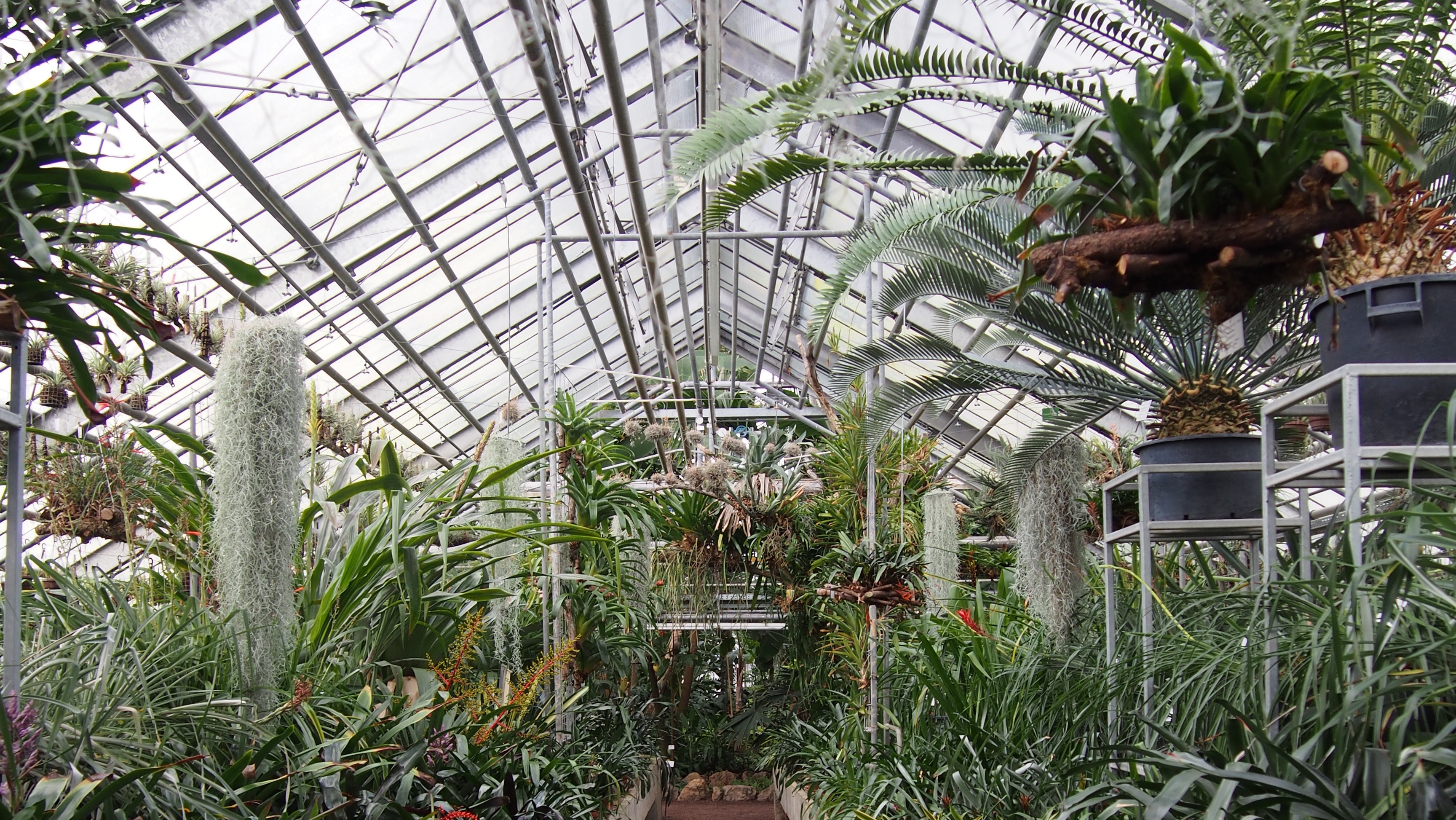 Vorbei an Bärlappgewächsen und Begonien geht es nun ins Tropenhaus. Die Luft ist feucht-warm, Kondenswasser tropft von den Blättern. Von irgendwoher plätschert es. Wir entdecken bekannte tropische Nutzpflanzen wie den Bananen- und Papayabaum oder die Kakaopflanze. Plötzlich reißt die Wolkendecke auf, Sonnenstrahlen fallen in das hohe Gewächshaus und tauchen den Miniatur-Dschungel in ein geheimnisvolles Licht. Bevor ich mich auf einer der Sitzgelegenheiten ausruhen und die Atmosphäre genießen kann, geht es schon weiter in das Bromelienschauhaus und das Victoriahaus. Hier lernen wir das kuriose Bromeliengewächs Tillandsia usneoides kennen. An Drahtseilen aufgehängt, erinnert die Pflanze mit ihren fadenförmigen Blättern an einen langen Bart. Als letztes führt uns Friederike Niestroj in das Sukkulentenhaus, das Pflanzen aus der alten und neuen Welt beherbergt. Ins Auge fallen als Erstes die verschiedenen Aloë-Arten, die jetzt im Winter ihre Blüten tragen. Daneben bestaunen wir nicht minder imposante Kakteen- und Wolfsmilchgewächse. Mit diesen Eindrücken werden wir aus dem Tempel der Pflanzenjäger verabschiedet.