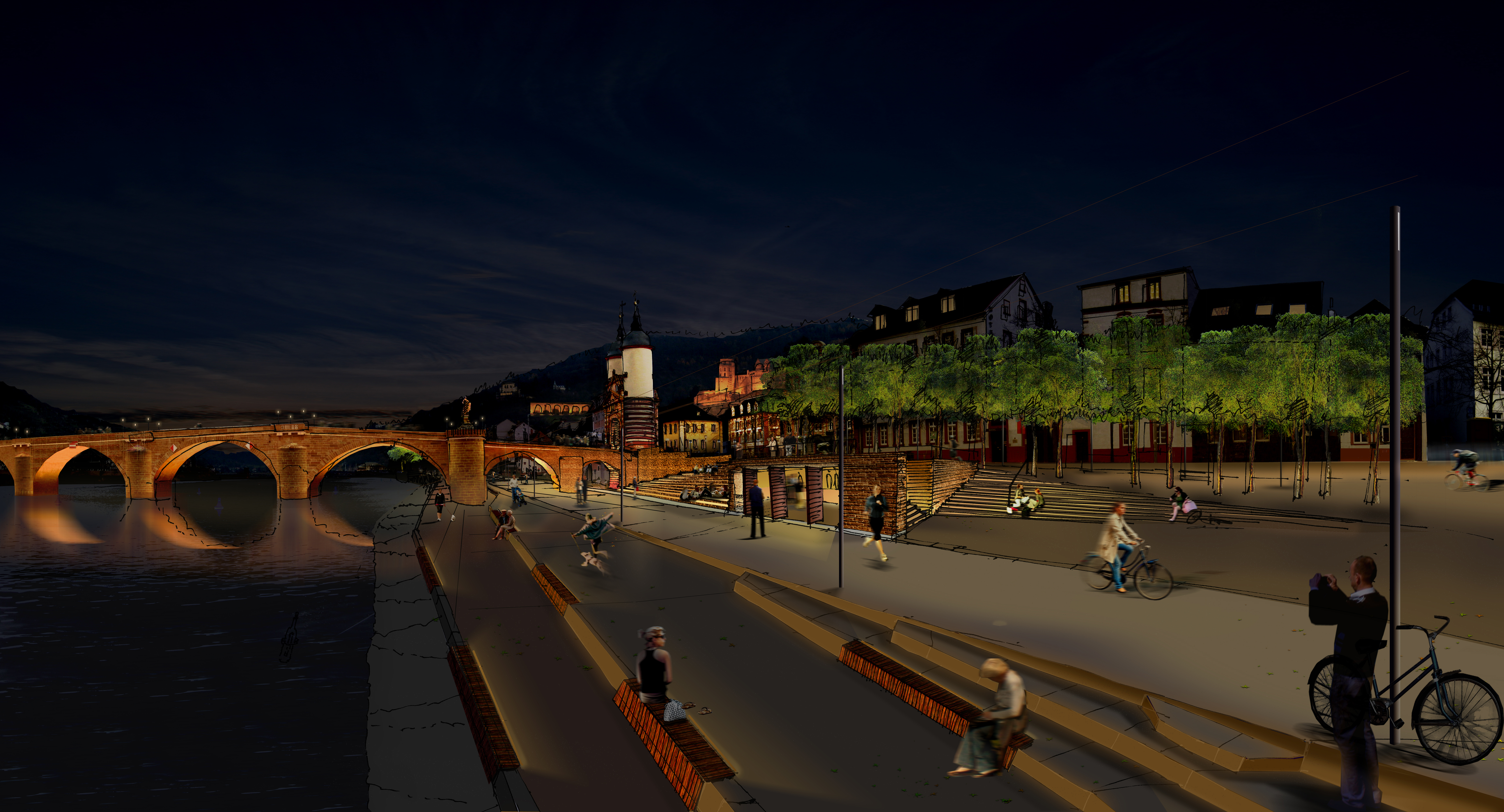 Es könnte doch so schön sein! Abendliches Flanieren am Neckar, hier aus dem Siegerentwurf des Architektenwettbewerbes 2009. Bild: Stadt Heidelberg