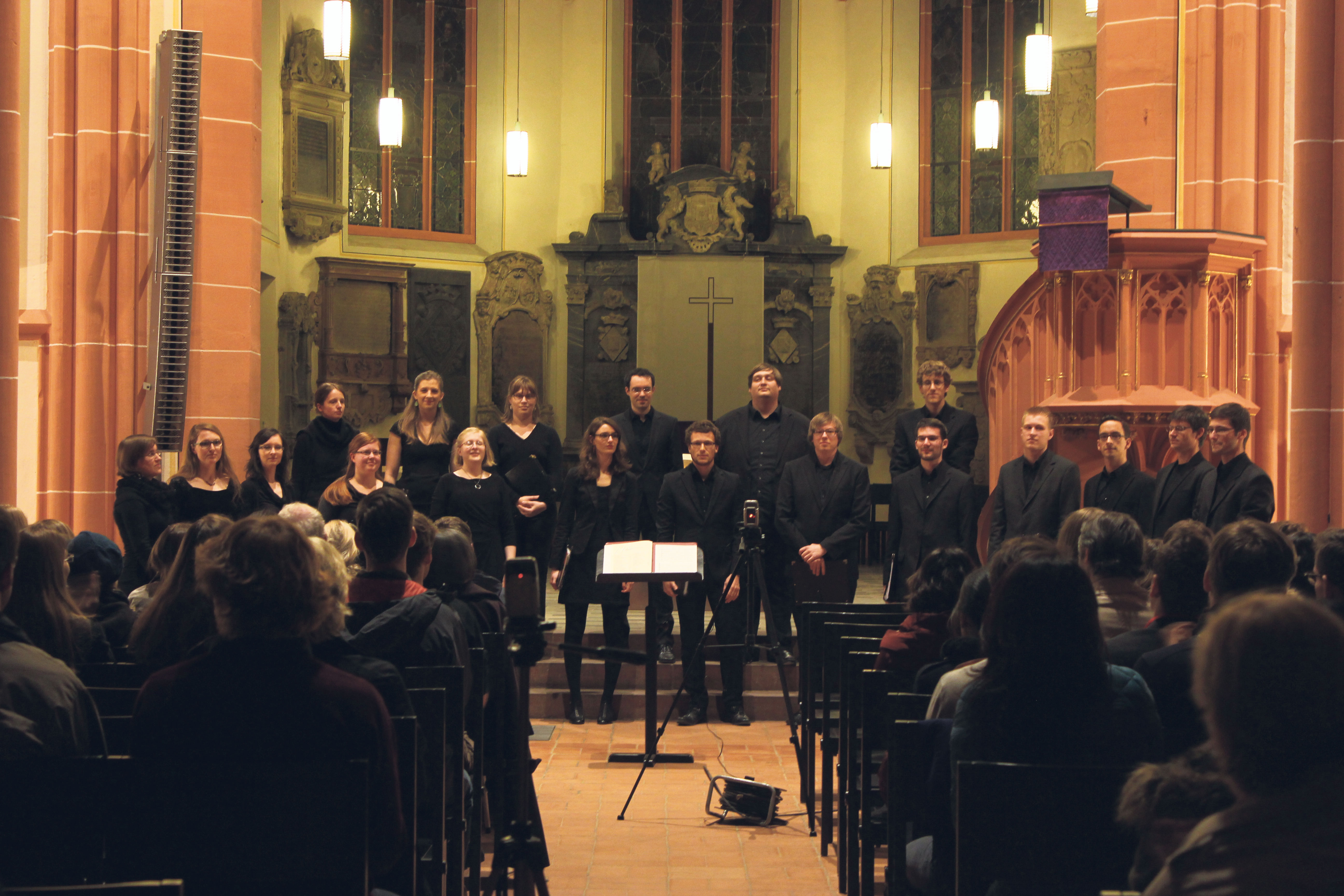 Ein beharrlicher Weg liegt vor den „Voces Salomonis“ – die Passion Christi in Sopran, Bass, Alt und Tenor. Doch bevor es für den Heidelberger Kammerchor an‘s Singen geht, steht erst einmal Grimmassen schneiden auf dem Programm. Die Lockerung der Gesichtsmuskulatur beherrschen alle perfekt und genauso behände geht es die Tonleiter auf und ab. Der kleine Probenraum ist warm, alle sitzen auf ihrem Platz und durch den Raum schwirren die Töne.