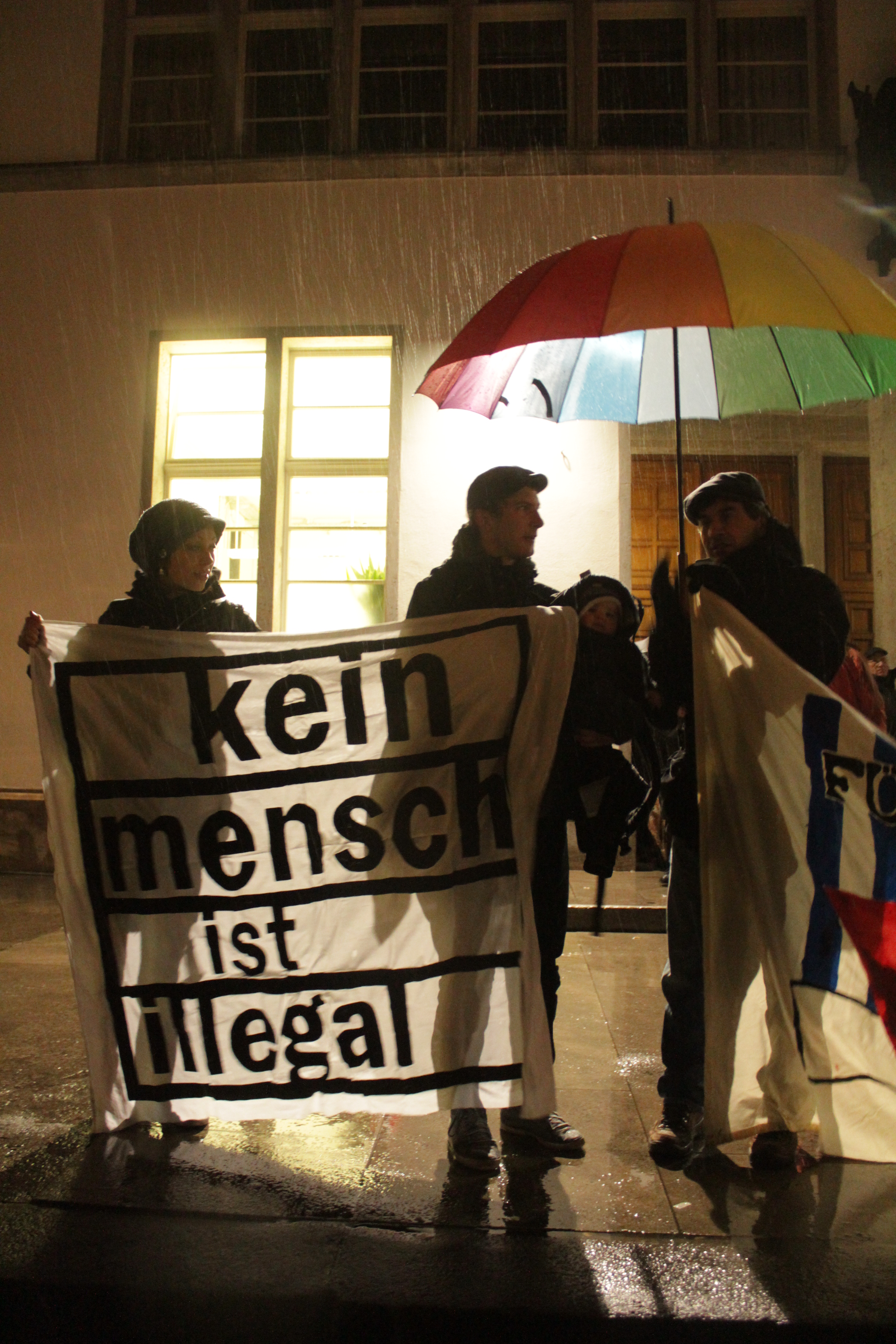 Insgesamt sprachen fünf Redner von dem durch bunte Scheinwerfer angestrahlten Podium zu den Menschen, die unter Regenschirmen den Witterungsbedingungen trotzten. Musik und gemeinsamer Gesang standen außerdem auf dem Programm.