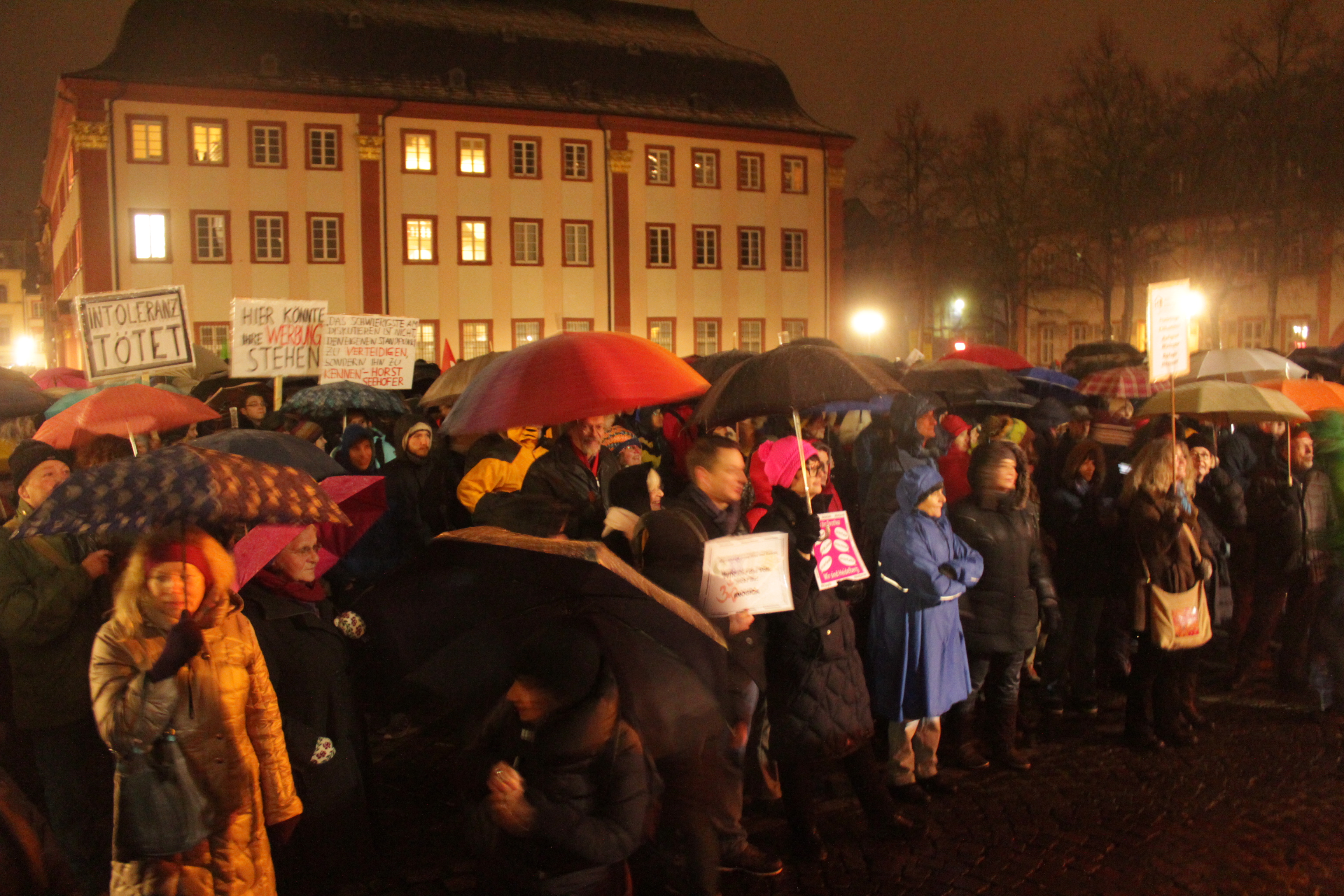 500 Demonstranten und fünf Redner, darunter Oberbürgermeister Würzner, bekennen sich zu Solidarität und Offenheit gegenüber Ausländern.