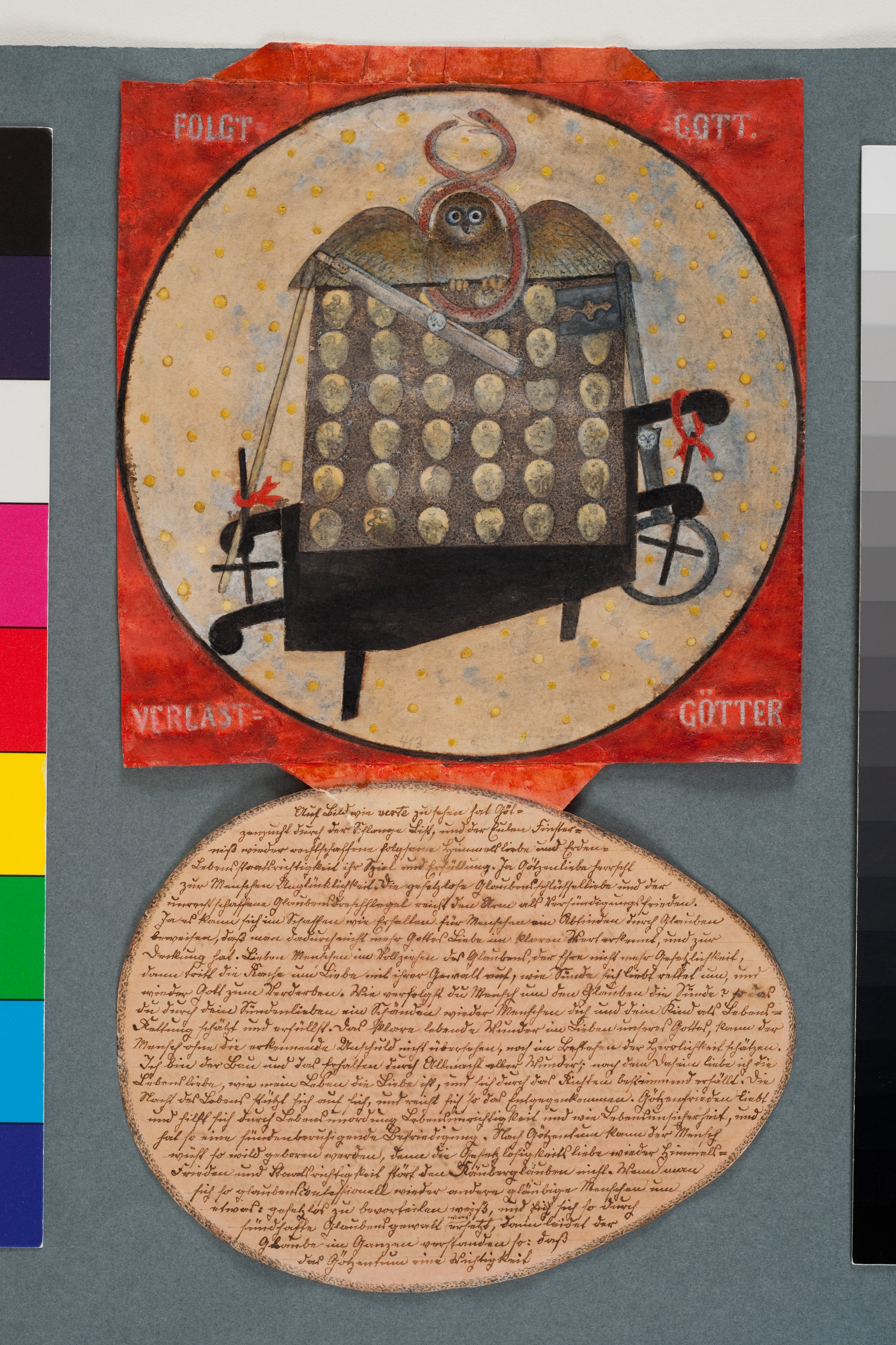 Die inhaltliche Nähe der Ausstellungsstücke zur psychischen Kondition der Künstler nimmt zu, je tiefer sich der Betrachter in die verwinkelten Räumlichkeiten der Prinzhorn-Sammlung hineinbegibt. So fallen bei einer ersten Reihe von Bildern nur leichte Abweichungen von der Norm auf. Ist dem in Uniform portraitierten Preußen der obligatorische Schnauzbart nicht leicht verrutscht? Dem folgen Werke, in denen die Schaffenden ihre eigenen Innenleben bildlich thematisieren. Ein von Wurmlöchern durchzogenes Hirn wird aufgedeckt, in einem Gewirr aus Radiowellen verliert sich eine vereinzelte Gestalt. Im Obergeschoss schließlich kulminiert die Schau in Darstellungen unheimlicher Wahrnehmungen. Eine göttliche Botschaft offenbart sich im durch Schweiß gezeichneten Muster einer Schuheinlegesohle.