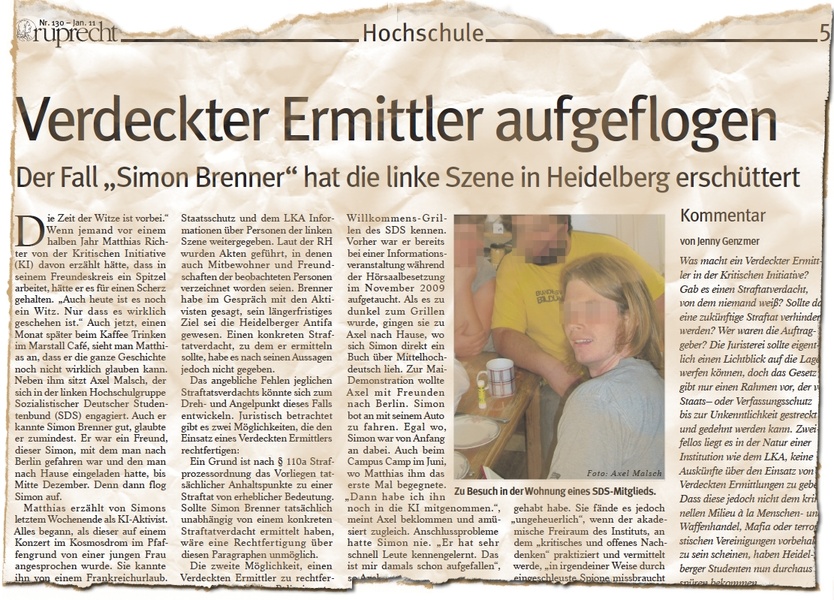 „Simon Brenner“, Polizist unter falschem Namen, hatte sich damals in Heidelberg als Germanistikstudent eingeschrieben und sich bei verschiedenen linken Gruppierungen, besonders beim SDS engagiert. Er freundete sich mit mehreren Aktiven an, nahm an Demonstrationen teil und organisierte sie selbst. Doch hinter dem Rücken der Bespitzelten gab er Informationen über die linke Szene in Heidelberg, Namen, Mitgliedschaften, Bekanntschaften an das LKA Stuttgart weiter. Selbst eine Wanze platzierte er in Räumen der Studierendenvertretung. Ende 2010 wurde Brenner dann zufällig enttarnt und von seinen Bekannten zur Rede gestellt.