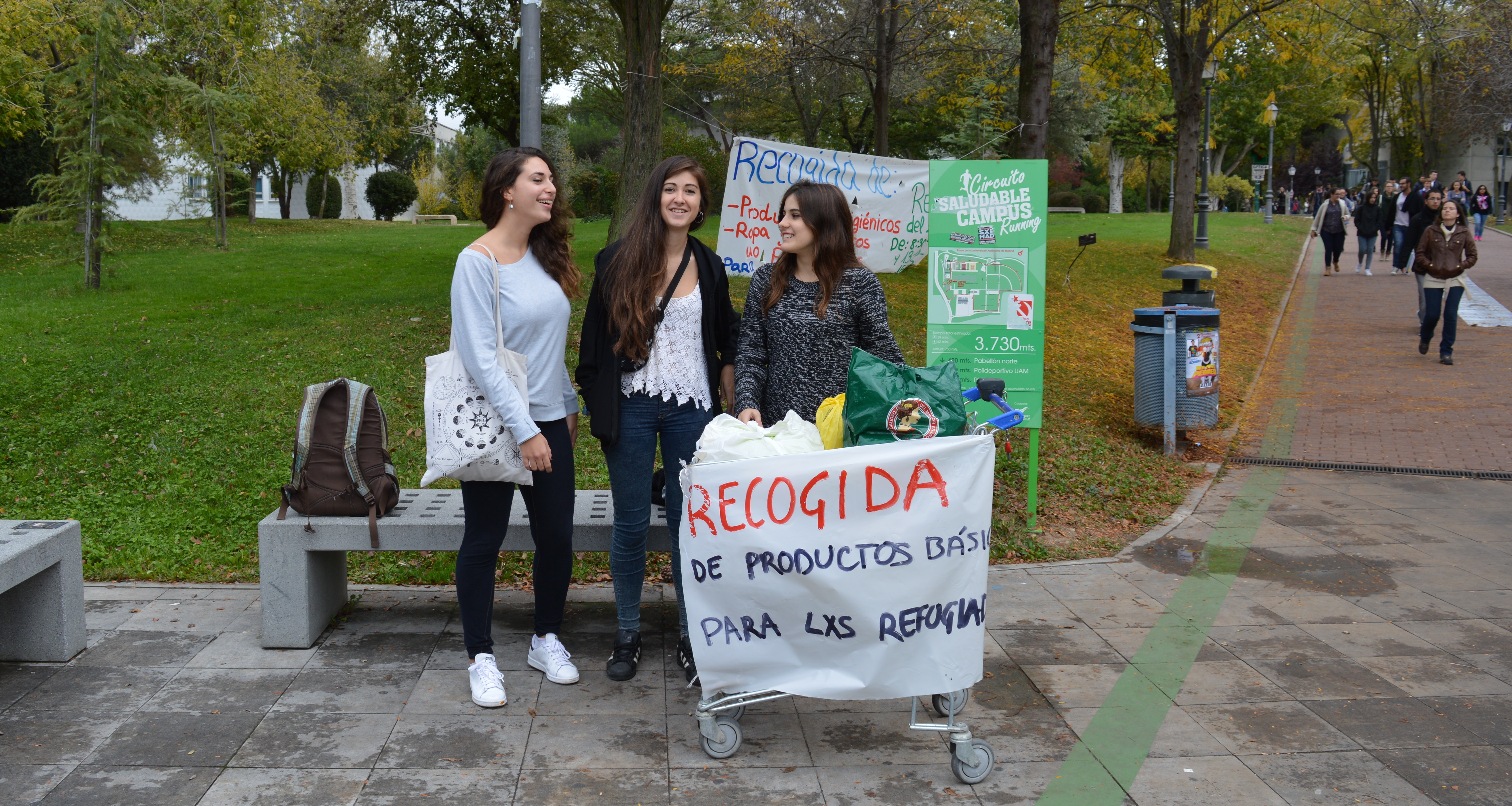 Studenten haben nun eine Initiative zur Unterstützung von Flüchtlingen gegründet.Besucher der Autonomen Universität Madrid werden zur Zeit bereits am Ausgang der Bahnstation mit diversen Protestaufrufen konfrontiert. Zwei Studenten liegen, eingehüllt in Aluminiumfolie, mitten auf dem Weg, um gegen sexuelle Gewalt zu protestieren. Banner kündigen Demos und Infoveranstaltungen an. Darunter findet sich auch das Plakat der neugegründeten studentischen Vereinigung „Asamblea bienvenidxs refugiadxs UAM“: Eine Woche lang sammeln Studenten auf dem Campus Kleidung, Verpflegung, Hygieneartikel und jede Art von Spenden für Flüchtlinge. Die Aktion trifft auf große Resonanz. Am Donnerstagmittag ist der Einkaufswagen, den die Studenten zum Transport benutzen, nach einer halben Stunde voll mit Kleiderspenden.