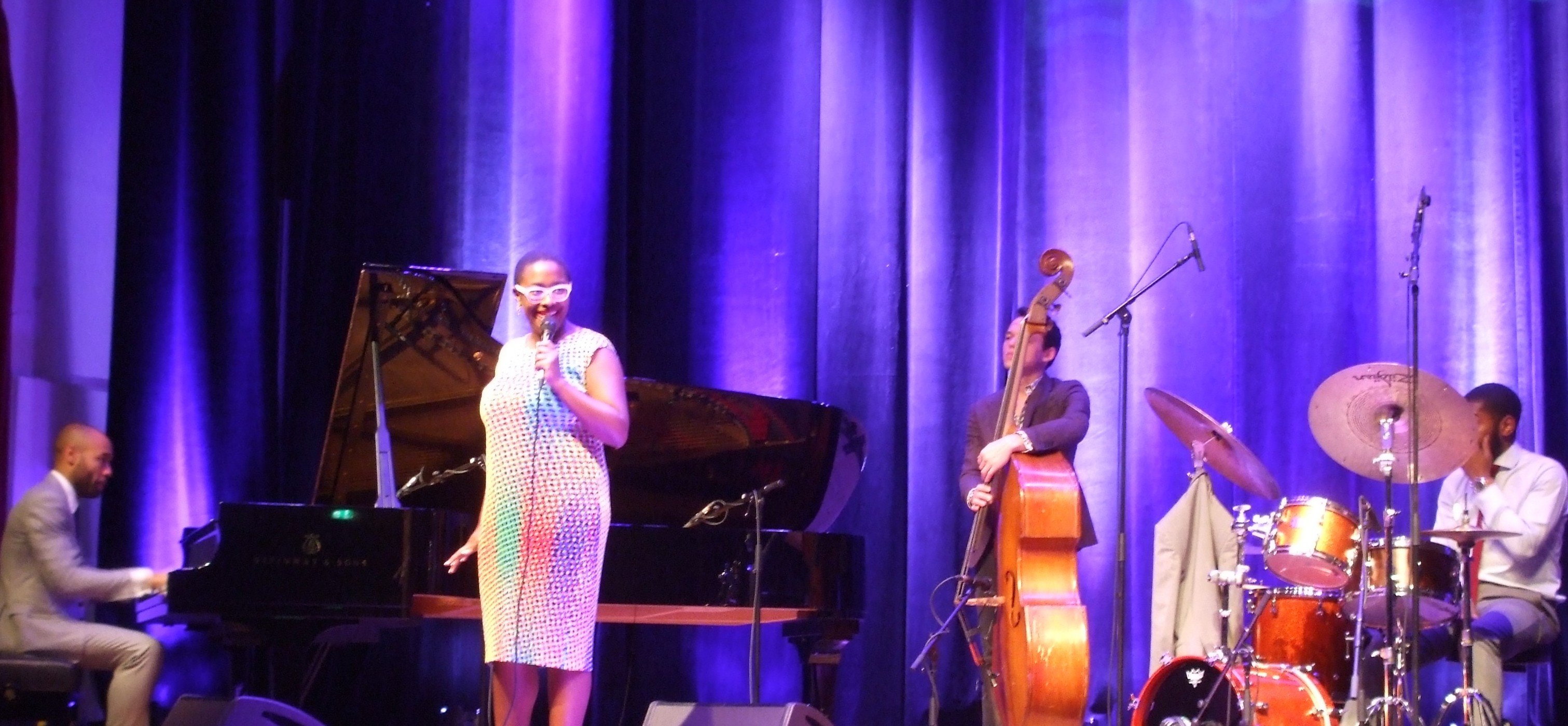 Nach einer virtuosen Einleitung durch ihr Begleittrio Aaron Diehl am Piano, Paul Sikivie am Kontrabass, und Lawrence Leathers an den Drums, betritt sie gemessen mit der für sie zum Markenzeichen gewordenen dicken weißen Brille die Bühne. Schon mit ihrem ersten Song „All of you“ von Cole Porter zieht sie ihr Publikum in den Bann. Weniger durch eine lebendige Gestik, denn vielmehr mit einer in ihrer Vielfalt erstaunlichen Mimik, die sich in ihrem Gesang wiederspiegelt, bekommt jedes einzelne Lied eine besondere, persönliche Note. Dabei singt sie nicht einfach nur Melodien, sondern lebt die Liedtexte, kokettiert mit jeder Silbe und bringt das Publikum durch ihre Interpretation zum Lachen. Es sitzt jede wohlüberlegte Bewegung, jede Aktion auf der Bühne. Vielleicht zu sehr. Nichtsdestotrotz scheint ihr vielfältiges Repertoire keine Grenzen zu kennen. Sie zeigt mehr als einmal die Formbarkeit ihrer gesanglichen Klangfarbe: In Sekundenschnelle wechselt sie vom mädchenhaften, schnörkellösen und wispernden zu voluminösen, überlauten und glockengleichen Gesang; von statuenhafter Reglosigkeit zur lebensfrohen Dynamik.