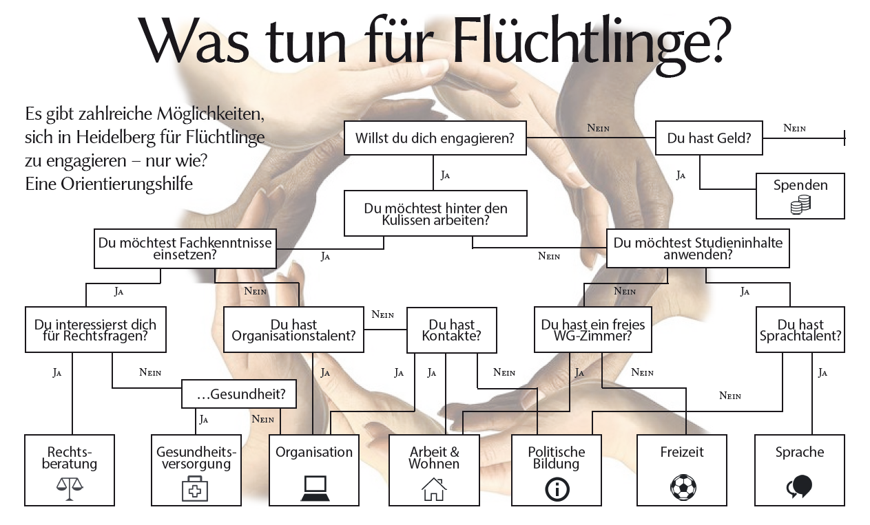 Wir haben Heidelberger Initiativen gebeten, ihr Engagement für Flüchtlinge vorzustellen. Neben den hier präsentierten Gruppen gibt es eine Reihe weiterer größerer und kleinerer Organisationen, die sich für Flüchtlinge einsetzen. Dazu gehört unter anderem der Asylarbeitskreis Heidelberg. Derzeit ist der Asylarbeitskreis in den meisten Bereichen ausgelastet, sucht jedoch weiterhin Dolmetscher für Sprachen aus den Fluchtregionen. Weitere Möglichkeiten bieten die Caritas, das DRK, das Sozialamt (Wohnungsangebote), das Manna und die Offene Uni Heidelberg. Eine Online-Übersicht bietet das von Heidelbergern ins Leben gerufene Portal www.helpcamp.de. Anhand der Postleitzahl werden Initiativen in der Umgebung angezeigt.[/box]