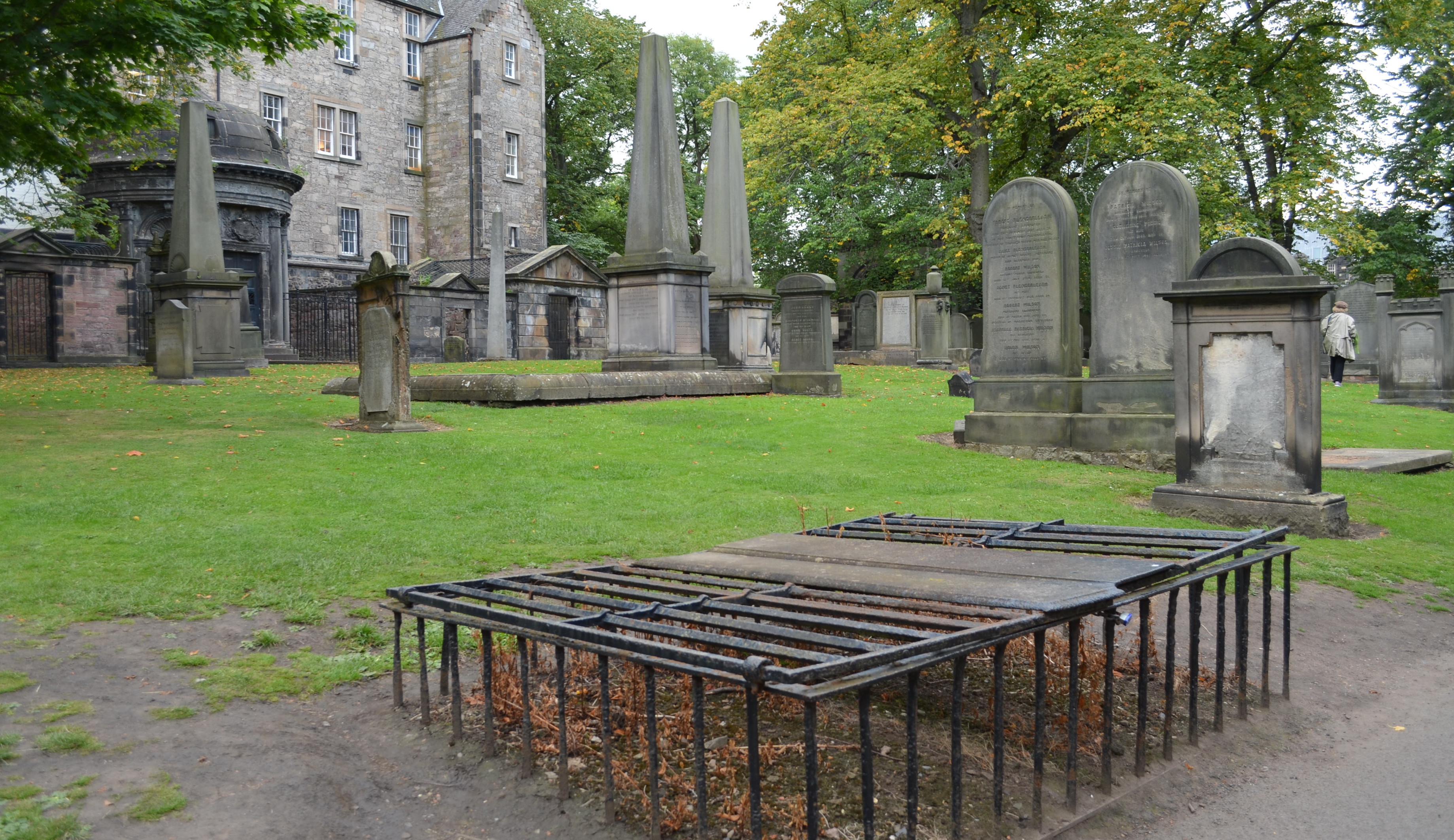 Doch damit fängt der Grusel erst an: Als Anfang des 17. Jahrhunderts das Medizinstudium an der University of Edinburgh erblühte, entstand ungewollt auch der illegale, aber doch sehr rentable Handel mit Menschenleichen. Frisch Beerdigte wurden des Nachts von Leichendieben wieder ausgegraben und am nächsten Morgen an Medizinstudenten zur Sektion verkauft. Da diese Praxis zu einer schändlichen Epidemie wurde und man das Unternehmen unterbinden wollte, errichtete man „Mortsafes“, imposante Metallgitter, die tief in den Boden hineinreichen, um das Grab und damit den Toten zu schützen, von denen zwei heute noch auf dem Friedhof zu sehen sind – wenn auch etwas verrostet.