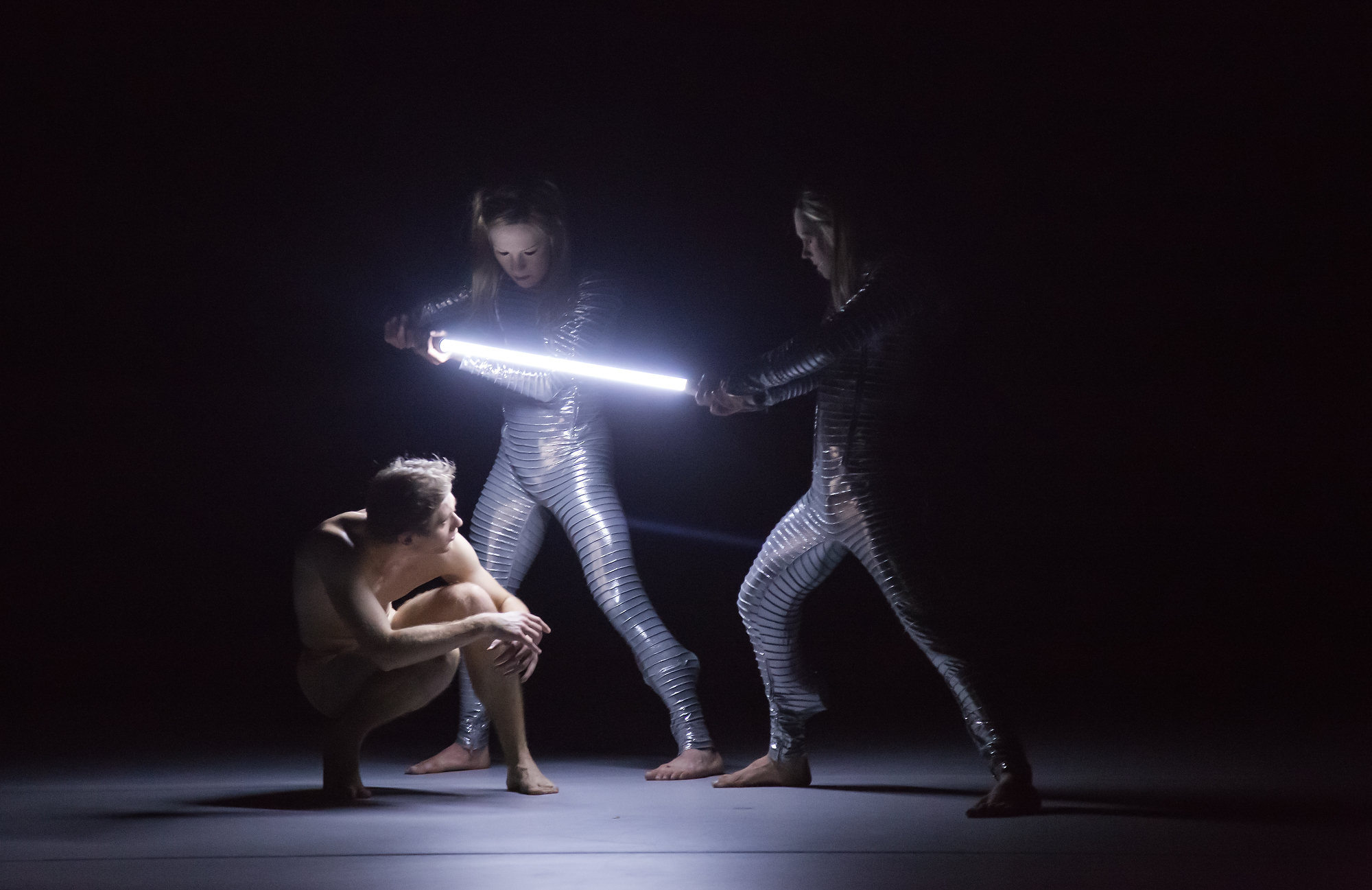 „Ach, diese ganze Kunstkacke hier geht mir doch auf den Sack!“, ruft er und schlägt in die Seiten seiner E-Gitarre. Der Vorhang fällt. Klassisch, stolz, das Bein perfekt angewinkelt, der Sprung katzengleich. Der Vorhang fällt. Silbergraue Wesen belagern nahezu nackte, menschliche Körper, kreisen sie ein. Der Vorhang fällt.
