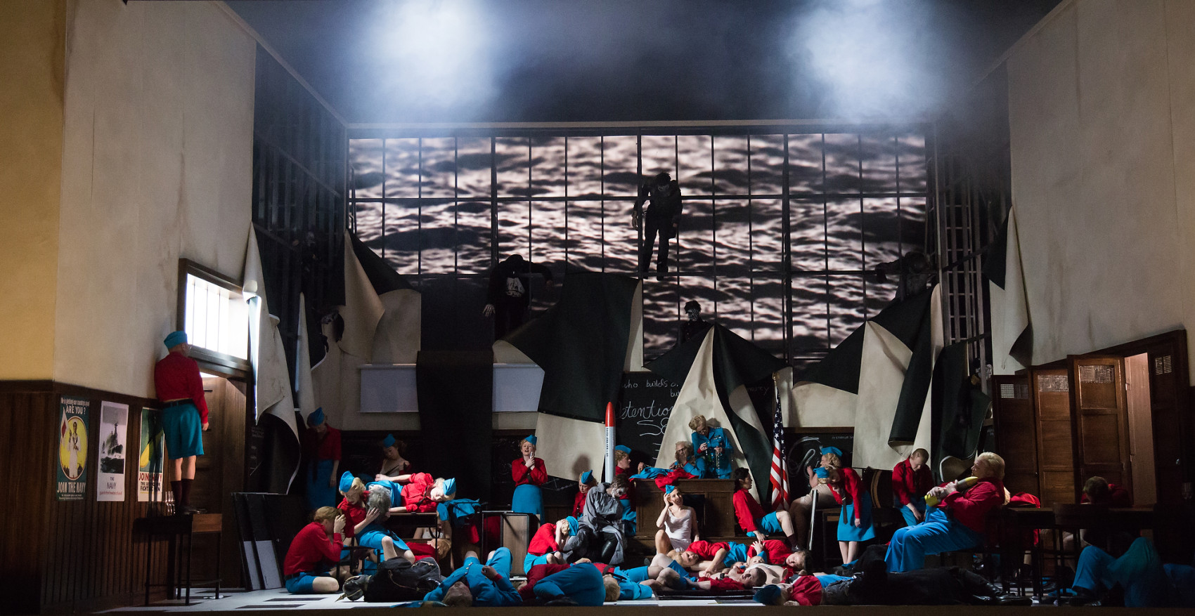 Der Zuschauer erlebt kein Schiff in stürmischer See, sondern einen spießigen Klassenraum der amerikanischen Navy. Der berühmte Seemannschor besteht aus jungen Kadetten, die wie Pfadfinder in kurzen Hosen marschieren lernen. Im Hintergrund laufen Schwarz-Weiß-Aufnahmen von kämpfenden Marines im 2. Weltkrieg. Kurz drängt sich die Frage auf, ob hier mal wieder ein Klassiker durch zu viel modernen Ehrgeiz ruiniert wurde. Die Kadetten in ihren blauroten Retrouniformen mit blonden Perücken wirken auf den ersten Blick wie die „Umpa Lumpa“-Zwerge aus „Charly und die Schokoladenfabrik“ und nicht wie raue Seemänner im Nordmeer. Aber Regisseurin Lydia Steiner überspitzt gekonnt die Kriegsbegeisterung in Wagners Werken und spiegelt auch den amerikanischen Militärstolz. Selbst die Frauen – im Original Spinnerinnen – sitzen kriegsbegeistert in der Rüstungsfabrik und schrauben lustvoll Raketen zusammen. Beim berühmten Spinnerinnenlied wird durch den großartig choreographierten Frauenchor der Krieg endgültig zu einer erotischen Fiktion verzerrt.