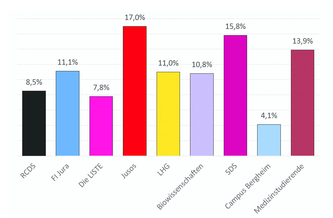 Die meisten Listenplätze besetzen die Juso Hochschulgruppe (17 Prozent) und der Sozialistische- Demokratische Studierendenverband (15,8 Prozent) mit jeweils drei Sitzen. Jusos und SDS gewannen damit im Vergleich zum Vorjahr einen beziehungsweise zwei Sitze hinzu. Ebenfalls verbessert haben sich die Liberale Hochschulgruppe (11,0 Prozent), der Ring Christlich-Demokratischer Studenten (8,5 Prozent), sowie die Fakultätsliste Biowissenschaften (10,8 Prozent) von einem auf zwei Plätze. Campus Bergheim sowie Die LISTE behalten ihren Listenplatz und auch die Fachschaftsinitiative Jura kann wie im Jahr zuvor zwei Vertreter in den neuen StuRa entsenden. Lediglich die Liste der Medizinstudierenden, Sieger der letzten Wahl, verliert mit 13,9 Prozent einen von drei Sitzen der letzten Legislaturperiode. Der Grund dieser Umwälzungen liegt jedoch nicht nur in der leicht erhöhten Gesamtbeteiligung. Mit der Grünen Hochschulgruppe trat eine der größten Listen des letzten StuRa nicht an. Sie war nicht in der Lage, genug Kandidaten für die Wahl aufzustellen.