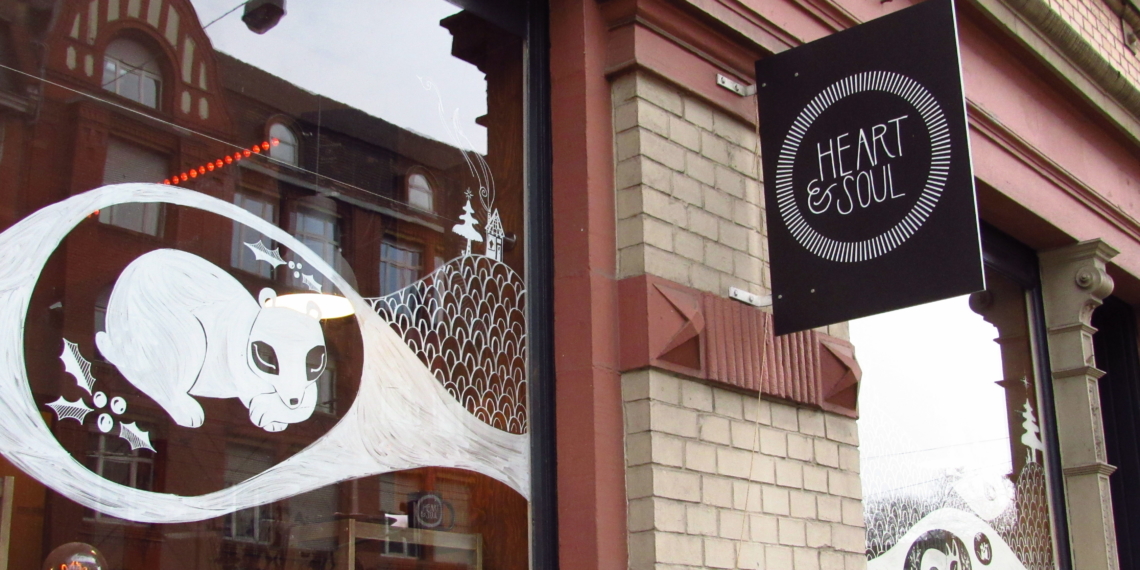 Das Heart&Soul ist ein Café, das nicht nur mehr sein will als ein Café, sondern das sich auch im ständigen Wandel vom Laden zum Coffeeshop und zurück befindet. Bei seiner Eröffnung im November 2015 war das Heart&Soul tatsächlich erst einmal per Lizenz ein Laden. „Dem Bauamt zu beschreiben, was wir hier vorhatten, war gar nicht so leicht“, so Michael Lange. Heute nimmt der gastronomische Aspekt mit Plüschsesseln und Storchbeintischen den Löwenanteil des minimalistisch anmutenden Raumes ein, während sich der Laden auf ein Regal mit Stücken von lokalen Künstlern beschränkt. Die meisten Stücke, wie Jutebeutel oder Schmuck, stammen aus der Zusammenarbeit mit dem Actionhouse e.V., einer DIY-Werkstatt in Heidelberg.