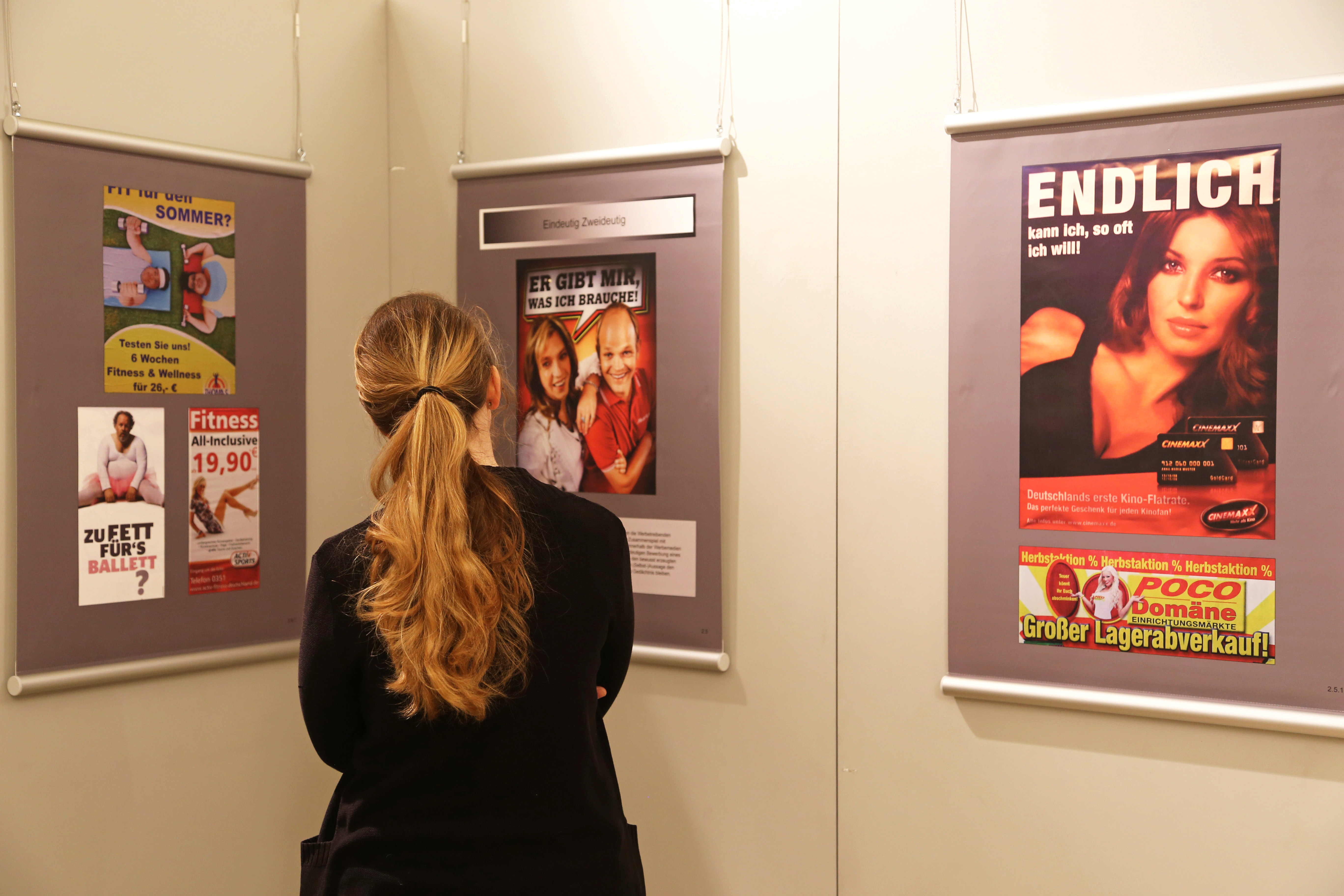 Bilder aus den lang vergangenen sexistischen Zeiten, die einen amüsieren sollen und eine wohliges Gefühl des „Wir haben es so weit geschafft“ vermitteln, sind in der Ausstellung nicht zu finden: Alle ausgestellten Stücke, darunter Werbeanzeigen der Dresdner Tagespresse, Plakate und Postwurfsendungen stammen aus den Jahren 2007 bis 2013. Die Ausstellung ist in verschiedene, leicht wirr angeordnete Subthemen gegliedert, welche sich mit den unterschiedlichen Dynamiken der diskriminierenden Werbung auseinandersetzen. Diese rangieren von subtilen Anspielungen auf traditionelle Geschlechterrollen, über unverblümtes Bodyshaming bis hin zu der „Ware Sex“ wo die Verbindung zwischen Produkt und nacktem Körper geradezu absurd zusammenhanglos ist.