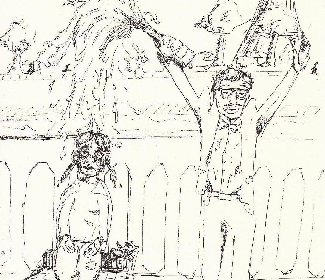 Gegenüber, an der Seitenwand des Kinos, hat sich eine kleine Familie unter dem Schutz des Vordaches und einiger notdürftiger Decken zusammengekuschelt. Sie sehen mitgenommen aus. In ihrer Mitte sitzt ein kleines Mädchen, sie trägt einen hellblauen Fleece-Pulli. Ihre viel zu kleine Hose reicht nur bis zum Knie. Gefesselt blickt sie ins Gesicht ihrer Mutter, die ihr eine Geschichte zu erzählen scheint. Den Lärm, der ihnen entgegenschallt, scheinen sie gar nicht wahrzunehmen. Plötzlich schreit das kleine Mädchen laut auf. Die Geschichte hat eine dramatische Wendung genommen, sie blickt ihrer Mutter entsetzt in die Augen. Der junge Mann, der eben noch lautstark mehr Champagner bestellte, schaut verwundert auf. Er bemerkt sie, senkt betroffen den Blick. Und blickt nicht mehr zurück.