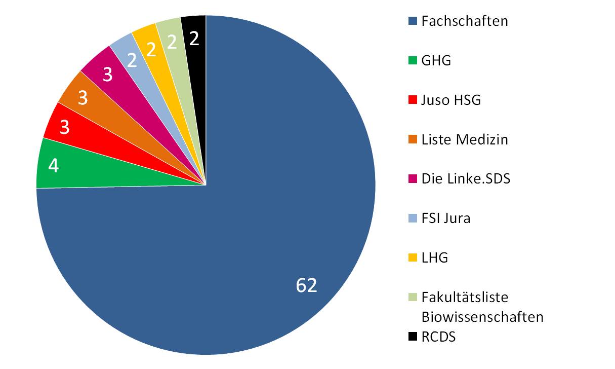 Im nächsten StuRa sind insgesamt acht Listen vertreten. Wieder in den StuRa zurückgekehrt ist die Grüne Hochschulgruppe (GHG). Im letzten Jahr aus Kandidatenmangel nicht mehr angetreten, können sie in der folgenden Legislaturperiode mit vier Sitzen die meisten Listenplätze besetzen. Sowohl die Juso Hochschulgruppe als auch die Linke. SDS können mit drei Sitzen ihr Vorjahresergebnis halten. Die Liste der Medizinstudierenden Heidelberg kann dagegen mit drei Vertretern eine Steigerung um einen Vertreter gegenüber der letzten Legislaturperiode vermelden. Der Ring Christlich-Demokratischer Studenten (RCDS), die Liberale Hochschulgruppe (LHG), die Fakultätsliste Biowissenschaften und die Fachschaftsinitiative Jura können ihr Vorjahresergebnis von zwei Sitzen halten. An den Kräfteverhältnissen der Hochschulgruppen im StuRa hat sich somit kaum etwas geändert.