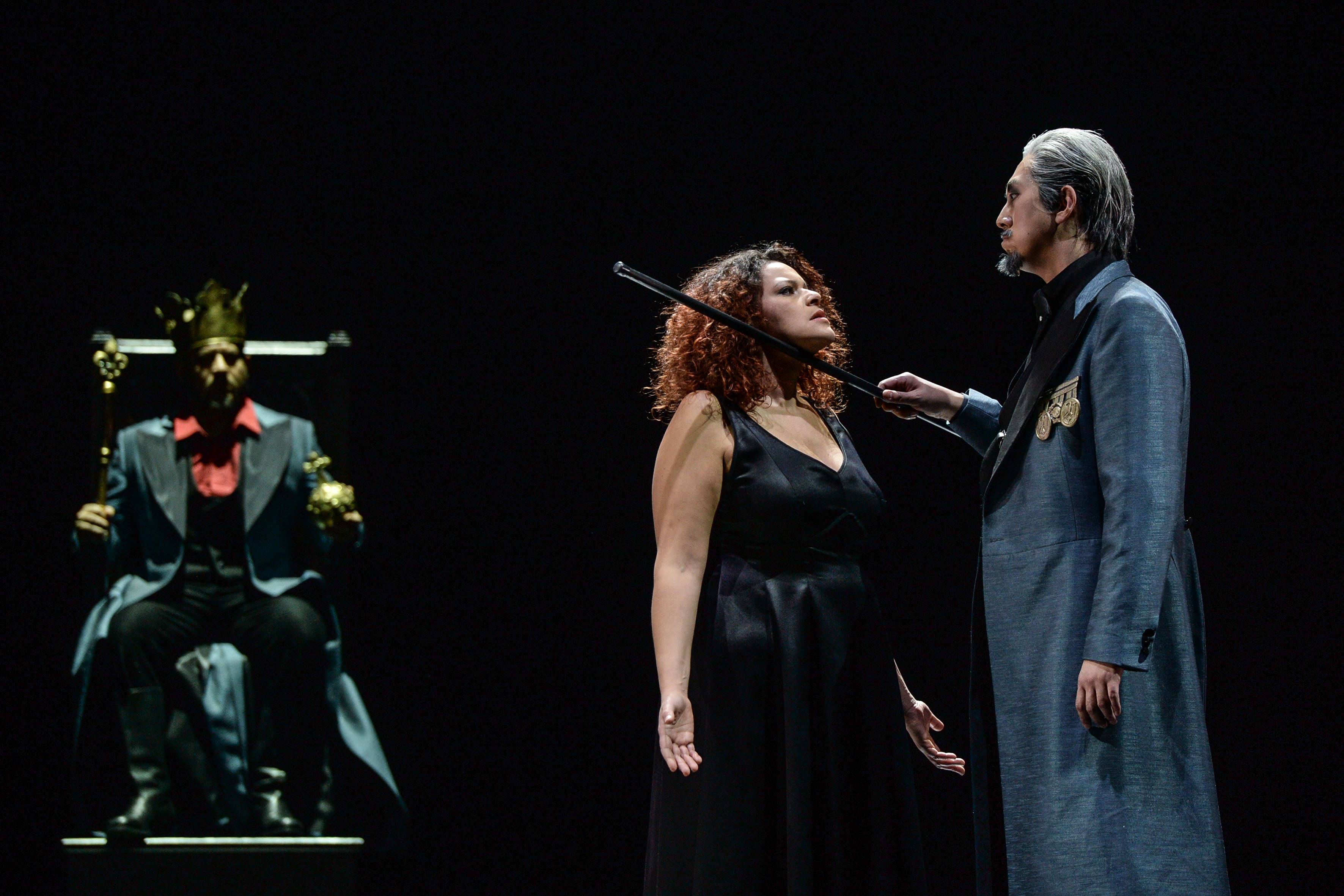 Auch die Handlung auf der Bühne ist an diesem Abend durch und durch dramatisch. Titelheld Ernani (Irakli Kakhidze) ist ein adelsstämmiger Rebell und Räuber im Spanien des beginnenden 16. Jahrhunderts. Und wie sich das für einen anständigen Heldentenor aus einer ebenso anständigen Verdi-Oper gehört, liebt er natürlich nicht nur Freiheit und Heimat, sondern vor allem eine Frau. Unglücklicherweise ist seine Elvira (Miriam Clark) nun schon mit dem alten Edelmann Silva (Sung Ha) verlobt. Sie will sich gerade mit ihrem schmucken Jüngling davonmachen, da taucht auch noch Carlo (Evez Abdulla), König im Inkognito, auf und gesteht der jungen Frau seine Liebe. Um alles noch komplizierter zu machen, verlagert sich der Kampf der drei Alphatiere bald von Elvira auf den Staat im Allgemeinen. Ein Kampf, der wirklich alles abfrühstückt, was das Opernklischee zu bieten hat: Hass und Liebe, Mord und Selbstmord und zum Abschluss – es handelt sich hier schließlich um Verdi – noch eine ordentliche Portion Patriotismus.
