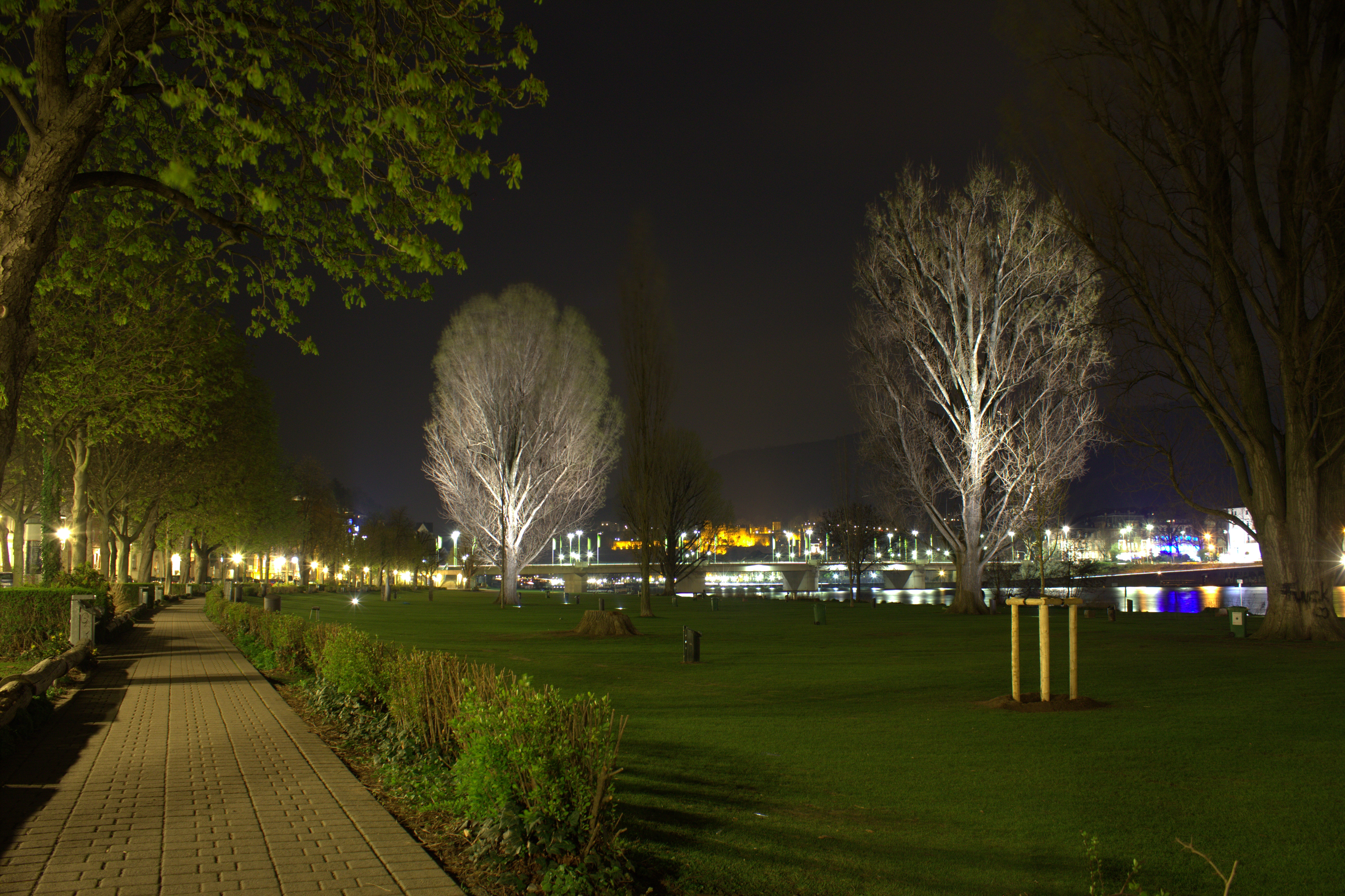 Die sogenannte Stresser-Beleuchtung an der Theodor-Heuss-Brücke strahlt bereits seit zehn Jahren. Kriminalität und störendes Verhalten findet für gewöhnlich im Dunklen statt, daher soll die Stresser-Beleuchtung nun bis zum Wasserspielplatz auf der Neckarwiese erweitert und durch zusätzliche Laternen und Strahler ergänzt werden. Ein Polizeiboot kann darüber hinaus vom Wasser aus mit einem Scheinwerfer Licht spenden, jedoch solle das die Anwohner zu sehr stören und daher keine dauerhafte Maßnahme sein. Die Testphase soll auch Erkenntnisse in der Feinjustierung der Beleuchtung bringen. Die Stadt Heidelberg sagt damit der Nacht den Kampf an. Der romantische Sonnenuntergang wird zum LED-aufgang und kalte Luft und Mücken sind keine Gründe mehr, das Ufergelände verlassen zu müssen. Dass mehr als 10 000 Lux auf der Neckarwiese in der Nacht sehr unattraktiv für das Neckarpanorama sind, rechtfertigt Bürgermeister für Umwelt, Bürgerdienste und Integration Wolfgang Erichson mit den bestehenden Problematiken und Gefahren am Ufer: „Mit der Romantik ist es nicht mehr weit her, wenn auf einem großen, dunklen Areal am Flussufer ein Angstraum entsteht, der keinerlei Aufenthaltsqualität mehr hat.“