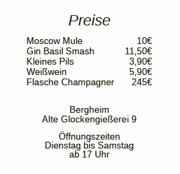 Eine Bar für alle will das Schilling mit seinem unprätentiösen Credo also sein – für alle, die mindestens zehn Euro für einen Gin Tonic oder Moscow Mule locker machen können. Letzterer kommt nicht in der üblichen Kupfertasse, sondern in einem blechernen Blumentöpfchen und gerät leider zum lauen Gurkensaft. Wer nicht für durchschnittliche Longdrinks zu begeistern ist, kann sich für stolze 18 Euro die günstigste Flasche pfälzischen Rosés genehmigen. Die wird aus Stylegründen sogar im goldenen Kühler kredenzt, der sich auf den zweiten Blick allerdings als Pflanzkübel von IKEA entpuppt.