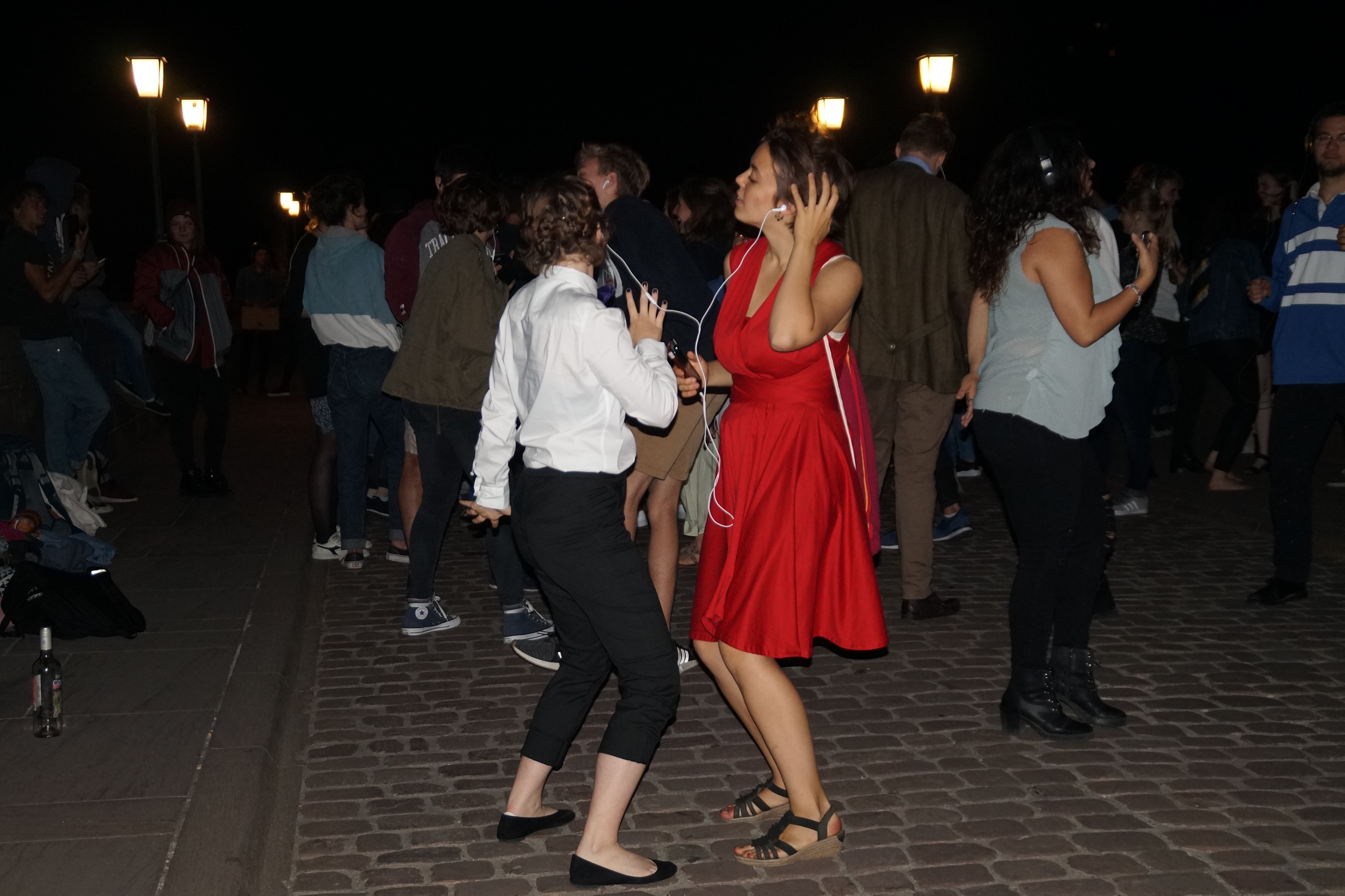 Anfangs sind hier und da noch zögerlich tapsende Füße zu hören, dort ein geflüstertes „Und was hörst du?“ Nach etwa einer halben Stunde nimmt die Sache Fahrt auf. Jetzt ist die Brücke eine Disco – aber nur ausnahmsweise silent.