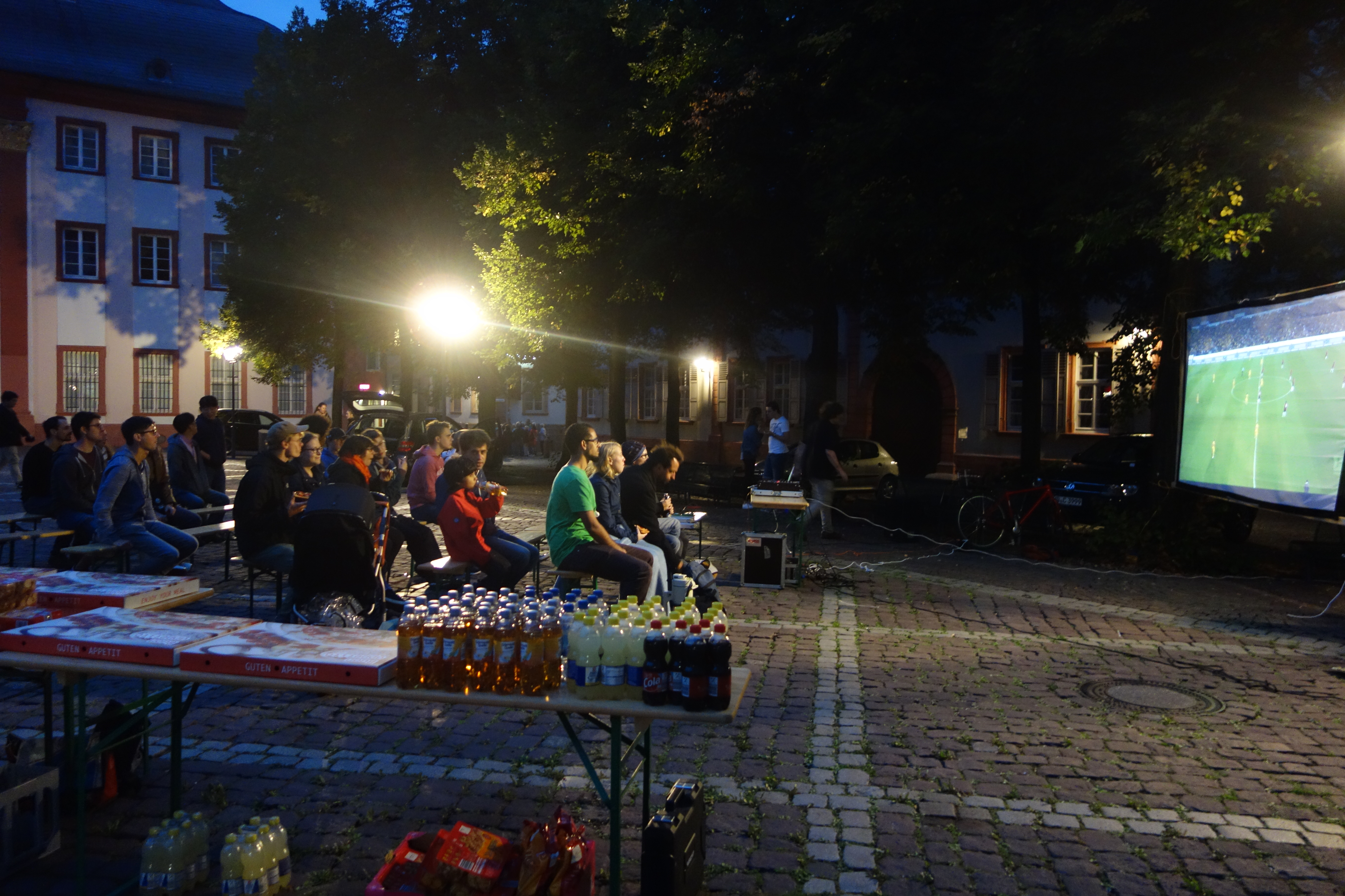 Rund 50 Personen haben am Freitagabend auf dem Universitätsplatz gegen den Umgang des Studierendenwerks Heidelberg mit seinen studentischen Beschäftigten protestiert. Die Referatekonferenz der Verfassten Studierendenschaft (VS) hatte im Vorfeld über die sozialen Netzwerke dazu aufgerufen, das Bundesligaspiel Hannover gegen Dortmund nicht im Marstall, sondern auf einer auf dem Universitätsplatz aufgebauten Leinwand anzuschauen. Damit sollte eine beliebte Veranstaltung des Studierendenwerks boykottiert werden. Laut dem Sozialreferent der VS gehe es darum, zu zeigen, „dass wir ohne das Studierendenwerk können, aber das Studierendenwerk nicht ohne Studierende.“