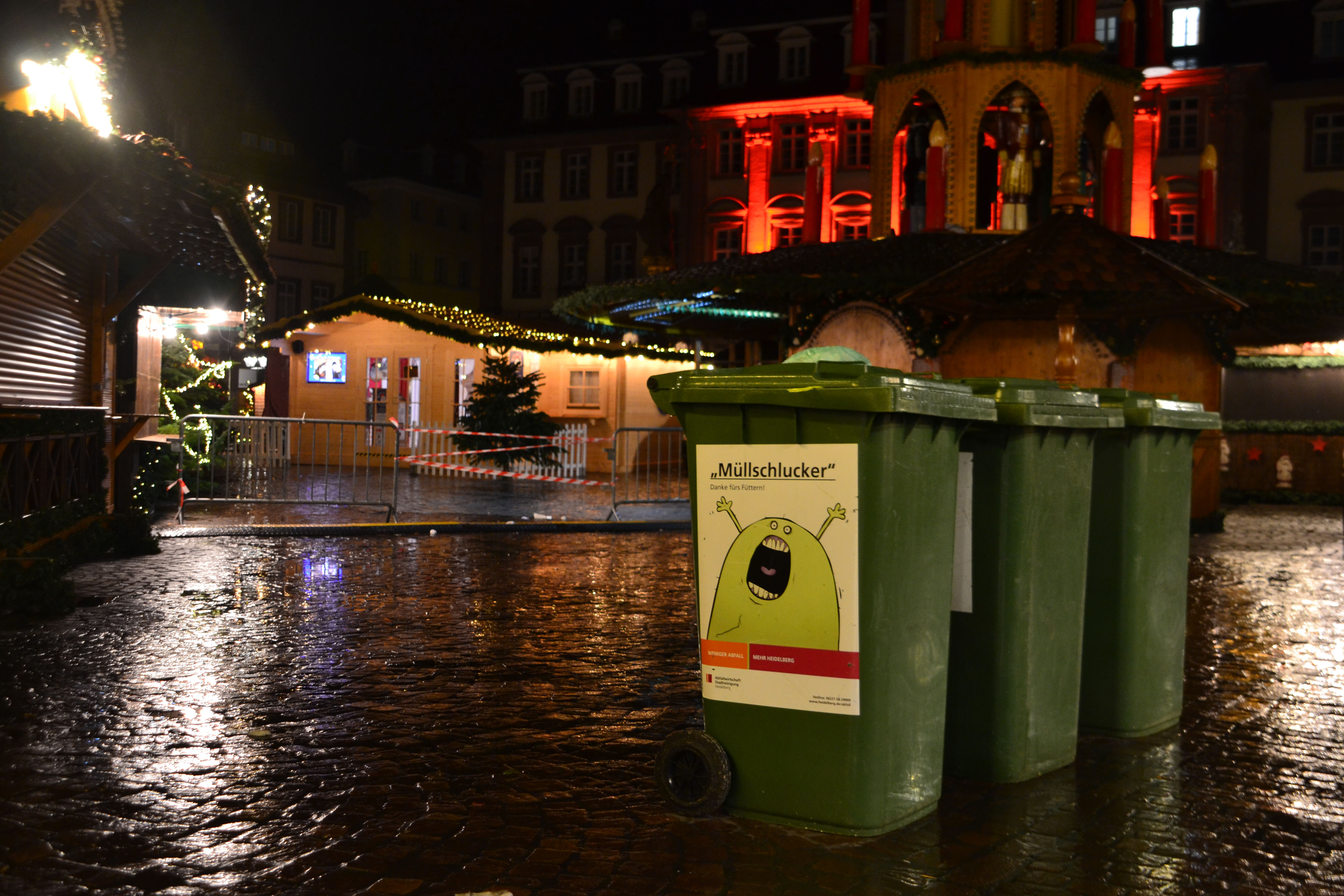 Zur Müllmenge, die tagein tagaus anfällt, kennt Weber keine genauen Zahlen. 55 zusätzliche kleine Partytonnen sowie mehrere große Container für Papier und Glas werden auf dem Weihnachtsmarkt aufgestellt, die Gesamtmenge Müll wird aber nicht gewogen. Ein Mitarbeier des Amts für Abfallwirtschaft erklärt, dass für sie durch den Markt keine zusätzliche Belastung anfällt.