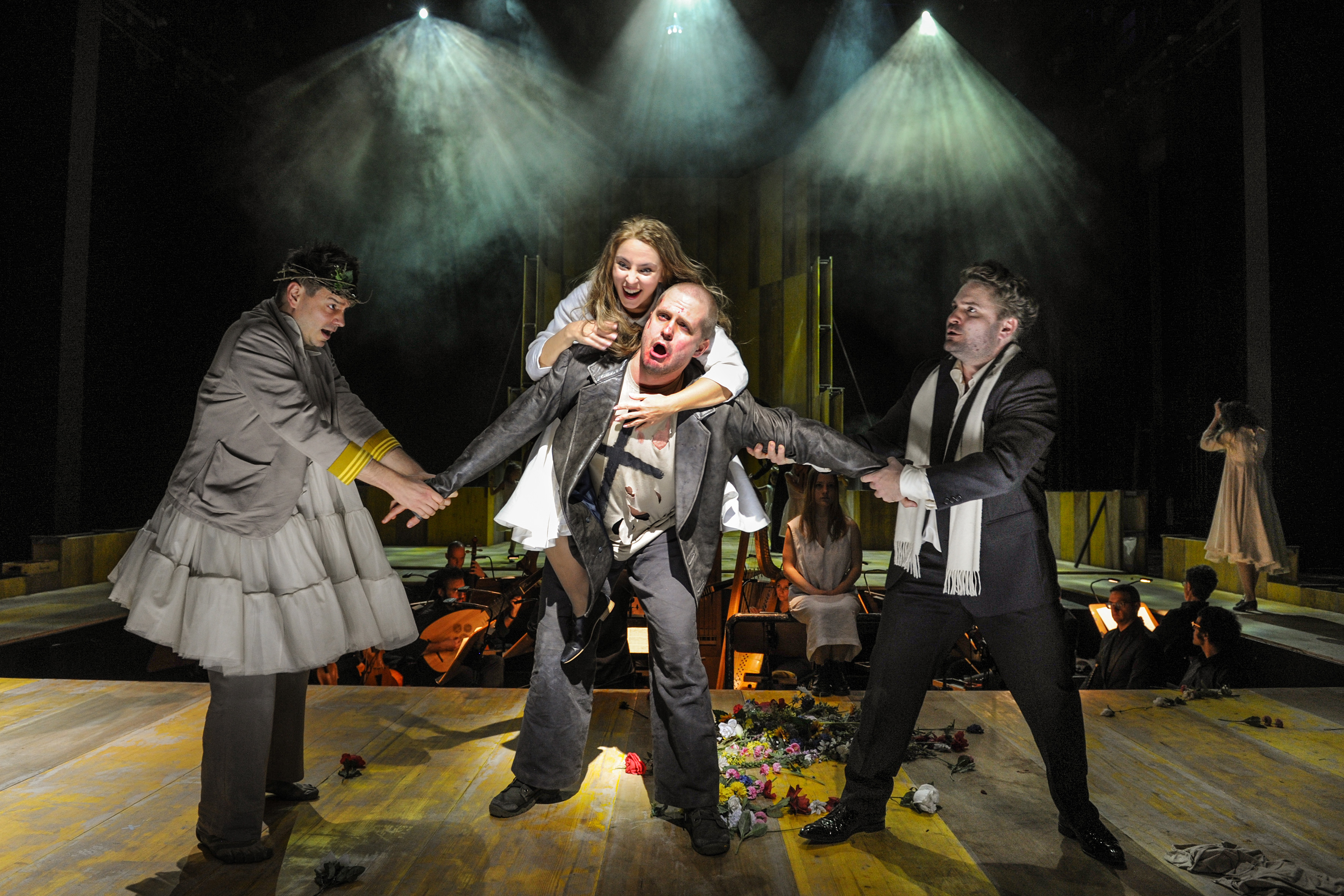Zur magischen Stimmung des Abends trägt auch das Bühnenbild von Anna-Sofia Kirsch bei. Es ist weit in den Zuschauerraum hinein vorgerückt und bildet aus gelbem Holz und Bauplanken die Form einer Kirche nach. In der Mitte sitzt das Orchester in einer leichten Vertiefung, während die übrigen Beteiligten rund um die Musizierenden agieren. Ganz hinten, im normalen Bühnenkasten verjüngt sich die Bühne und wächst gen Himmel, während die vorderen Seitenlogen des Zuschauerraums als Seitenemporen der nachgebauten Kirche dienen. Mit dem geschickten Lichtspiel (Nicole Berry) entsteht eine intime, vertraute Atmosphäre, die den warmen und weichen Klang der Barockinstrumente ebenso wie die grundsätzliche Stimmung dieser „Marienvesper“ unaufgeregt schön in Szene setzt. Sonst wirkt die Inszenierung von Calixto Bieito ein wenig erratisch: Die Sänger schwirren als Jesusimitat, als Wahnsinniger, als abgedrehte Mischung aus schwarztalarigem Lehrer und abgestürztem Racheengel mit zerfleddertem Flügel über die Bühne. Das Ganze folgt keiner eigentlichen Handlung, wie bei der handlungslosen „Marienvesper“ auch nicht anders zu erwarten. Stattdessen kreist die Inszenierung um die verschiedenen Facetten des Maria-Mythos: Maria als Mutter, als Jungfrau, Heilige, als begehrte und begehrende Frau. Diese Assoziationssplitter reichert Bieito mit Eindrücken und Figuren seines Aufwachsens in einem kleinen katalanischen Dorf an. Das ist in Ordnung und stört nicht sonderlich – nötig gewesen wäre es freilich nicht. Denn am schönsten wird es an diesem Abend, wenn man die Augen schließt, die bezaubernde und bezaubernd gespielte Musik durch sich hindurchfließen und seinen ganz persönlichen Assoziationsstrom mittanzen lässt.