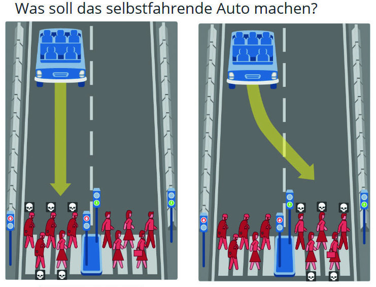 Grundsätzlich ist das Problem immer das Gleiche: Ein selbstfahrendes Auto kann in einer Notsituation nur manche Menschen retten, die jeweils Anderen werden beim Aufprall getötet. Dem unbedarften Nutzer kommt nun die Aufgabe zu, Entscheidungen zu treffen. Und die haben es in sich: Wer darf leben, wer muss sterben?
