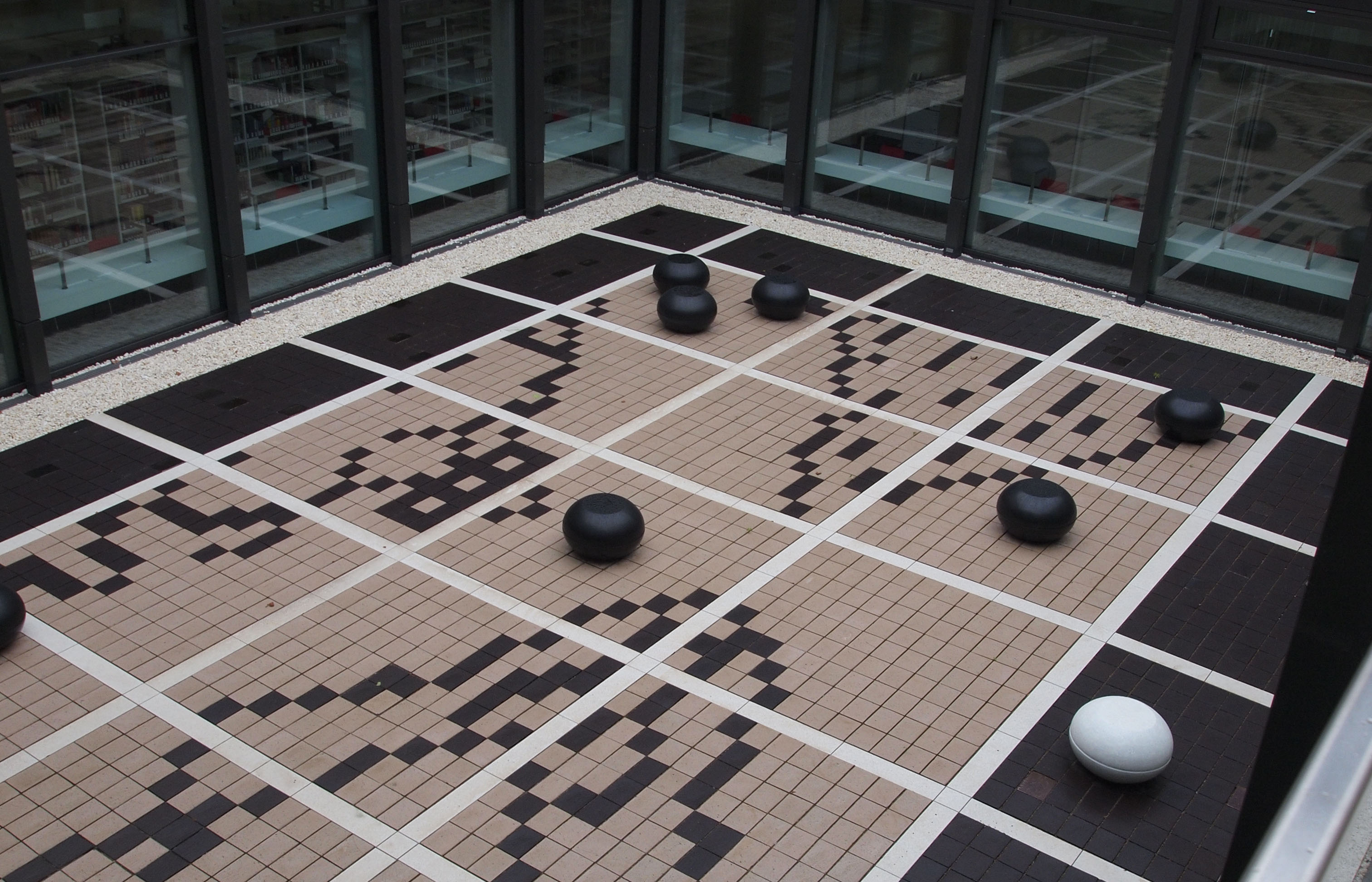 Eher praktischer Natur sind die elliptischen Steine im Innenhof: Die Sitzgelegenheiten erinnern an die Spielsteine des jahrtausendealten chinesischen Strategiespiels Go/Weiqi.