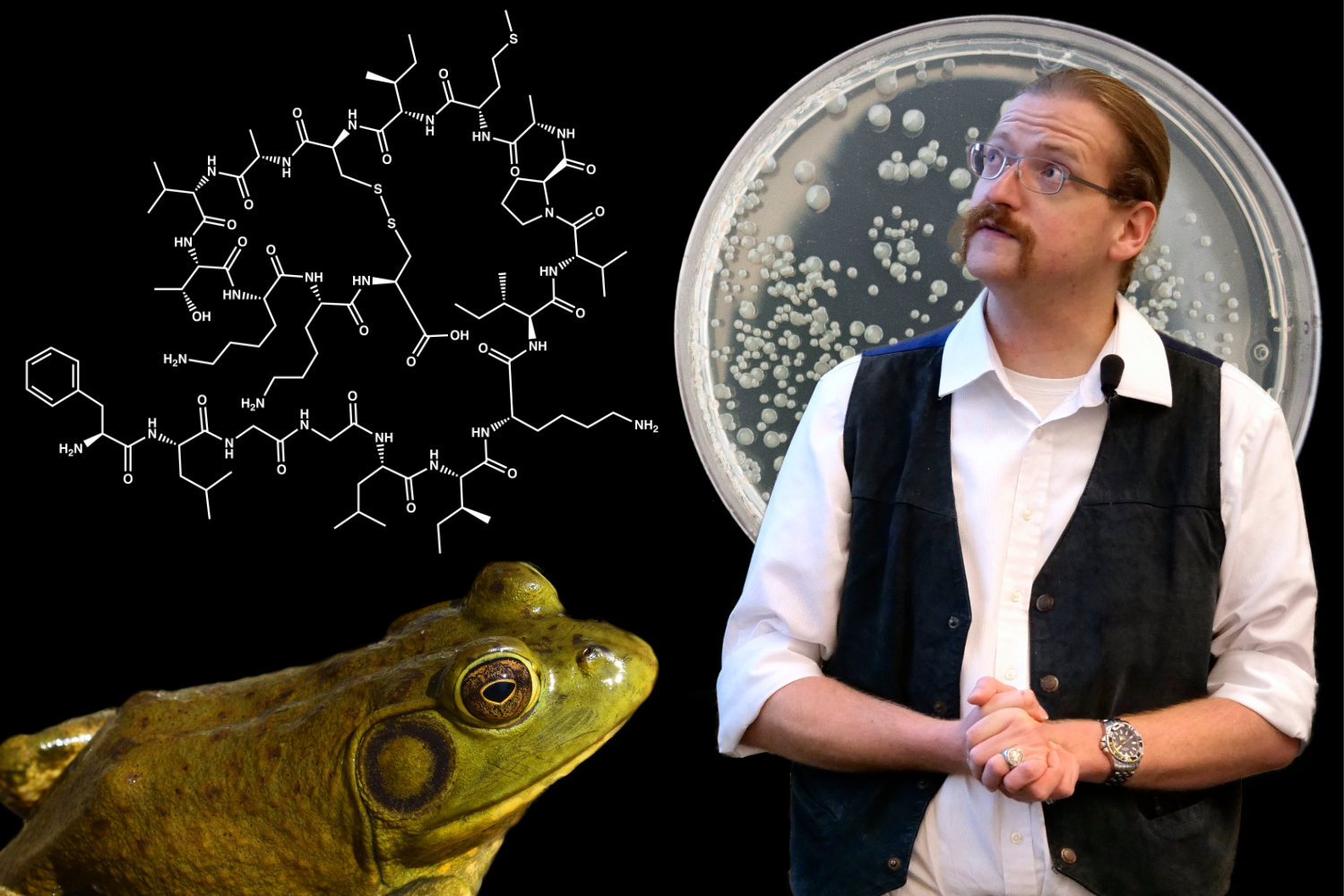 An einem solchen Reserveantibiotikums arbeiten Cornelius Domhan und sein Team. Das Peptid Ranalexin aus der Froschhaut ist, wie fast jeder Naturstoff, von sich aus erst einmal nicht als Arzneistoff geeignet. Weil die Substanz aus 20 Aminosäuren besteht, würde sie von körpereigenen Enzymen wie Nahrung verdaut werden. Ein Arzneistoff muss jedoch eine gewisse Zeit im Körper verbleiben, um seine Wirkung zu entfalten. Die Aufgabe für Domhan bestand zunächst darin, herauszufinden, welcher Teil der Substanz für deren antimikrobielle Wirkung verantwortlich ist. Im Trial-and-Error-Verfahren mussten mehrere hundert Varianten hergestellt und getestet werden, bis eine wirksame gefunden war. Das nächste Ziel war es, die Stabilität und die Verteilung im Körper zu verbessern. Dies gelang durch mehrfache Modifikation des Biomoleküls mit unterschiedlich langen Fettsäuren. Außerdem konnte dadurch auch die antimikrobielle Aktivität auf gram-negative multiresistente Problemkeime erweitert werden, die sich von gram-positiven Keimen grundlegend im Aufbau ihrer Zellwand unterscheiden. Ein nächstes Etappenziel ist in Sicht – die Toxizität des antimikrobiellen Peptids für den Menschen zu verringern.