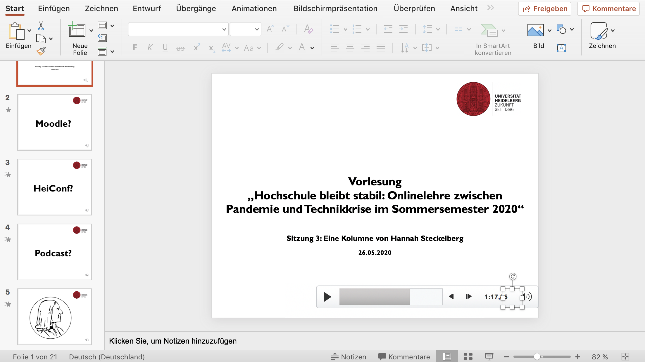 Aber die Onlinelehre bietet noch andere Herausforderungen: Einer meiner Professoren lädt zum Beispiel jede Woche die aktuellen PowerPoint-Folien zur Sitzung hoch, inklusive Audiokommentar. Pro Folie dauert der Audiokommentar im Schnitt zwischen einer und anderthalb Minuten. Ich muss beim Anhören also ständig umschalten und den neuen Kommentar anklicken und komme so gar nicht erst in einen anständigen Workflow. Notizen mache ich am liebsten handschriftlich; jede Minute zwischen Mousepad und Stift wechseln müssen nervt. Lieber Professor , wenn Sie das hier lesen: Nehmen Sie doch bitte einen Podcast auf.