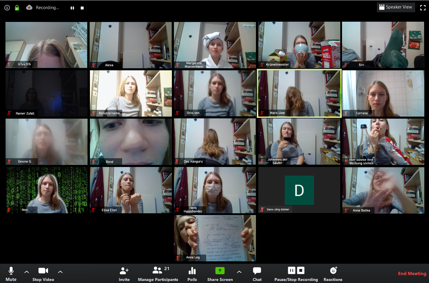 Wenn man nun aber sprechen muss (oder will), was ist mit der Kamera? Nicht nur eine Frage der Internetbandbreite. Sollen alle sehen, wie ich gelangweilt hinter meinem Schreibtisch vermodere? Und falls ja: sollen die anderen meinen ganzen Oberkörper betrachten können oder nur einen Teil meiner Stirn? Sollte ich die Dartscheibe mit dem Gesicht des Dozenten abhängen? Darf ich mich jetzt überhaupt noch bewegen oder nur lächeln und winken wie die Queen?