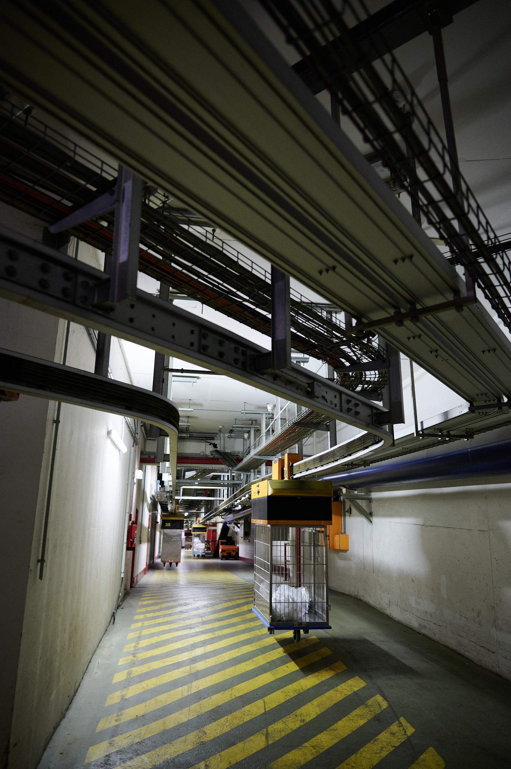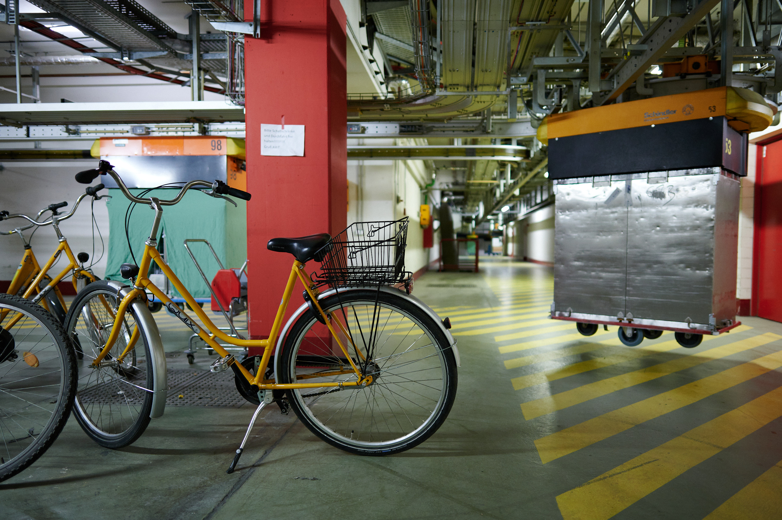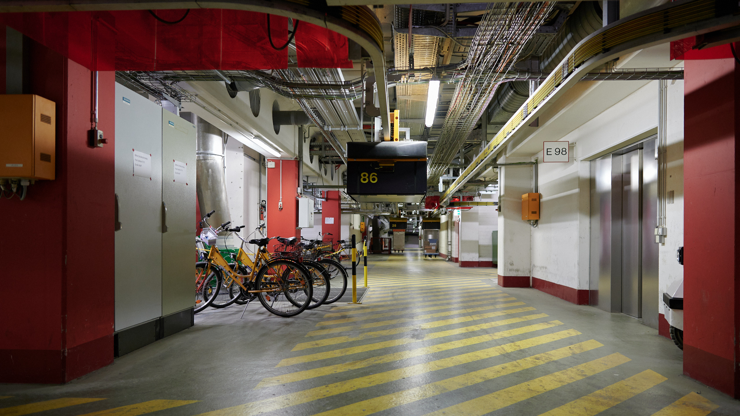 Zwei Stockwerke unter dem Neuenheimer Feld herrscht zeitweise so viel Verkehr wie an der Oberfläche. Hier – auf Ebene 98 – radeln Techniker:innen auf senfgelben Fahrrädern durch lange Gänge, Elektroschlepper kündigen sich hupend an, bevor sie mit ihren Anhängern um eine Ecke biegen und die wenigen Fußgänger:innen bewegen sich unbeeindruckt neben den vielen schwebenden Wägen, die von einer autonomen Transportanlage in die verschiedenen Kliniken befördert werden.