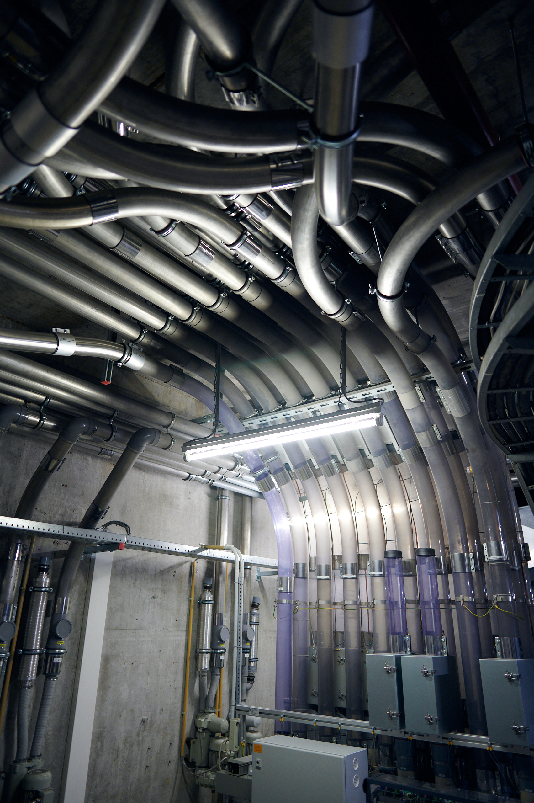 Überwacht werden die AWT und die restliche Gebäudetechnik in der zentralen Leitwarte im Versorgungszentrum. Bei Störungen sowie für Wartungsmaßnahmen und Installationen machen sich Handwerker:innen von dort aus auf den Weg, aufgrund der kilometerlangen Tunnel nehmen sie dafür meist das Rad.