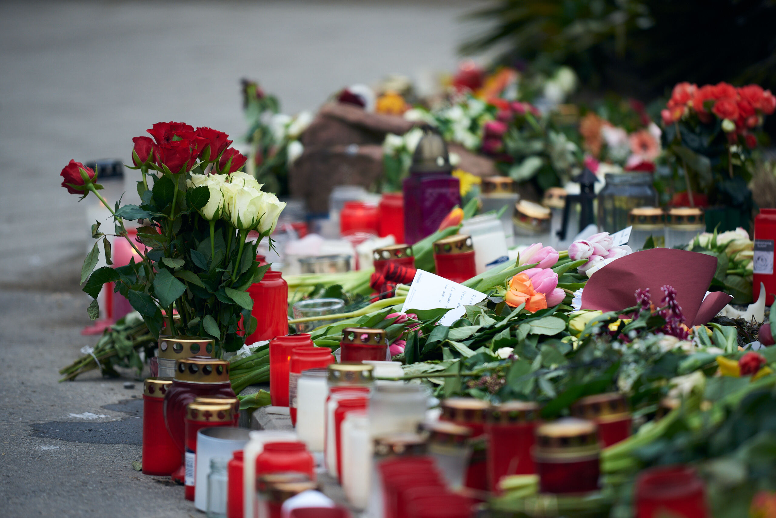 Es ist 12:55. Studierende und direkt Betroffene legen weiße Rosen vor den kerzenbeleuchteten Altar. Fast die ganze Trauergemeinde reiht sich in die lange Schlange ein. Manche halten sich in den Armen, wiegen sich hin und her. Manche stehen leise, ganz alleine da. Das Meer der weißen Rosen wächst stetig an.
