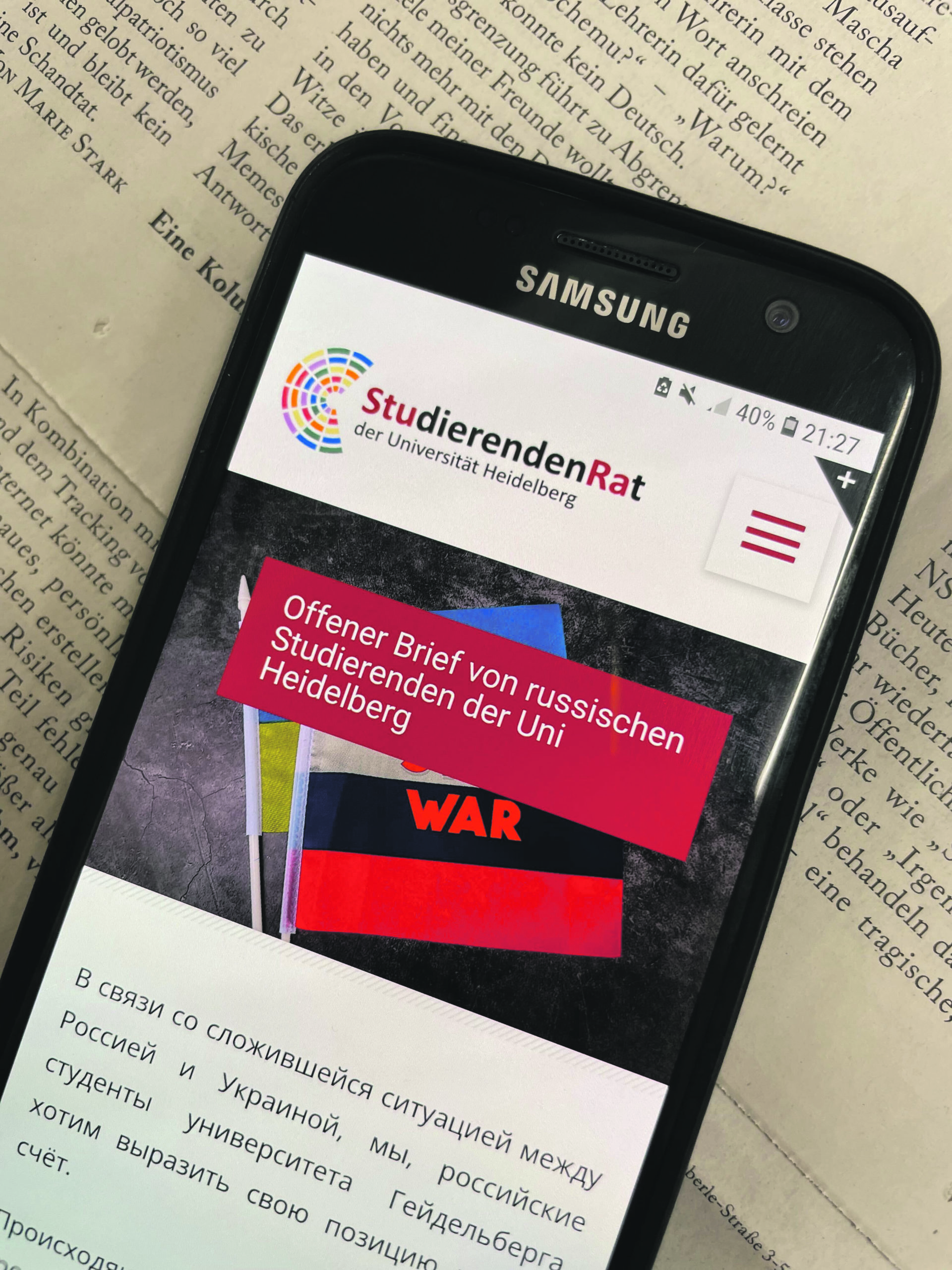 Es ist der 28. Februar 2022. Der sechste Tag in Putins Krieg. Die Heidelberger Studentin Polina teilt einen Beitrag auf ihrem Instagram-Account. Es ist ein offener Brief der russischen Studierenden der Universität Heidelberg. „Wir sind gegen den Angriffskrieg“ ist darauf zu lesen. Polina ist Russin, sie hat den Brief mit den anderen Studierenden zusammen verfasst.