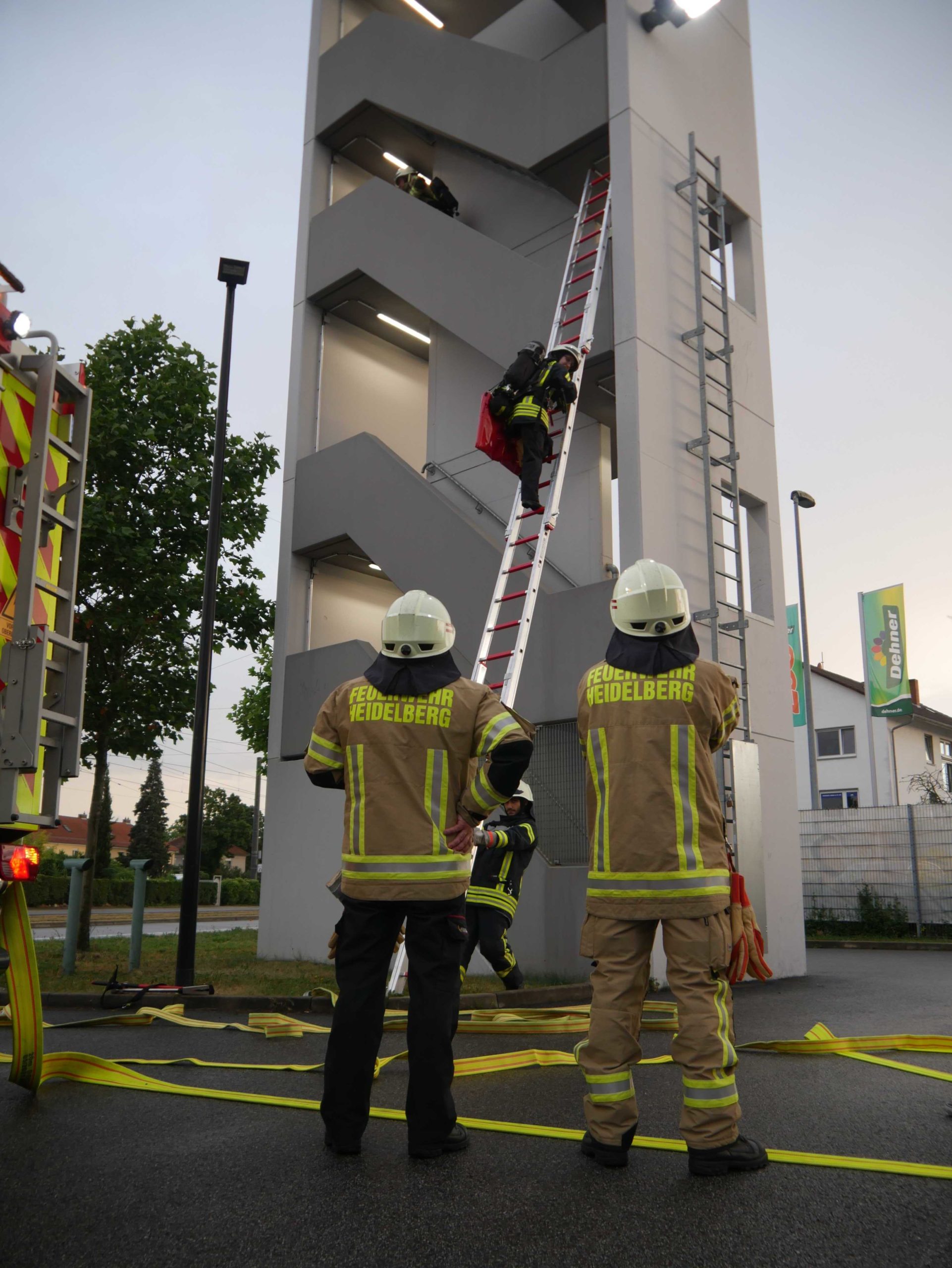 Eine Person zieht sich um Hilfe schreiend an einem Fenster hoch, neun Meter über dem Boden. Im unteren Stock sieht man Feuer, das Treppenhaus ist gefüllt mit Rauch. Mit diesem Szenario sehen sich die Mitglieder der Freiwilligen Feuerwehr konfrontiert, zum Glück nur als Trainingssituation. Im Ernstfall, das heißt hier im Brandfall, muss jeder Handgriff sitzen. Daher übt die Freiwillige Feuerwehr jeden zweiten Mittwoch verschiedene Einsatzsituationen. Schläuche werden ausgerollt und an Hydranten befestigt, Leitern aufgestellt und Schutzanzüge angelegt, Brandfälle simuliert. Die Feuerwehrkräfte der Abteilung sind jung, eine Mehrheit von ihnen sind Studierende – wie lässt sich dieses ehrenamtliche Engagement mit dem Studium vereinbaren?