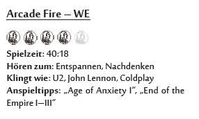 Danach gibt es einen Bruch: Plötzlich klingt Arcade Fire wie auf ihrem ersten Studioalbum („Funeral“), oder sogar noch davor. Nur die Melodien sind eingängiger, fast schon mitreißend in „End of the Empire I-III“ und „The Lightning I“. Letzteres fühlt sich mitunter an wie eine Entschuldigung an diejenigen Fans von Funeral, die vom letzten Album bitter enttäuscht wurden.