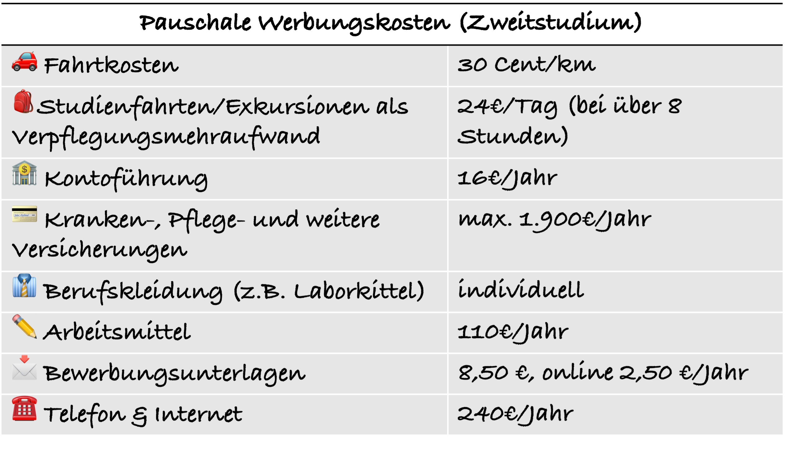 Als Student:in kannst du auch ohne Einkommen einiges aus deiner Steuererklärung rausholen. Dafür bist du am besten im Zweitstudium oder in deiner Zweitausbildung (das heißt mit Ausnahmen im Master, zweiten Bachelor, ersten Bachelor nach einer Ausbildung, duales Studium). So kannst du zum Beispiel deine Studienkosten, also dein neues Notebook, das Semesterticket, Lernmaterialien, deine Studiengebühren oder deine Anreise zur Uni über den Verlustvortrag steuerlich geltend machen. Das sind die sogenannten Werbungskosten, welche im Entstehungsjahr abgesetzt werden müssen. Hebe dafür deine Belege auf, um deine Ausgaben notfalls nachzuweisen. Für einiges gibt es auch Pauschalen, du musst also nicht für jeden Bleistift einen Beleg haben.