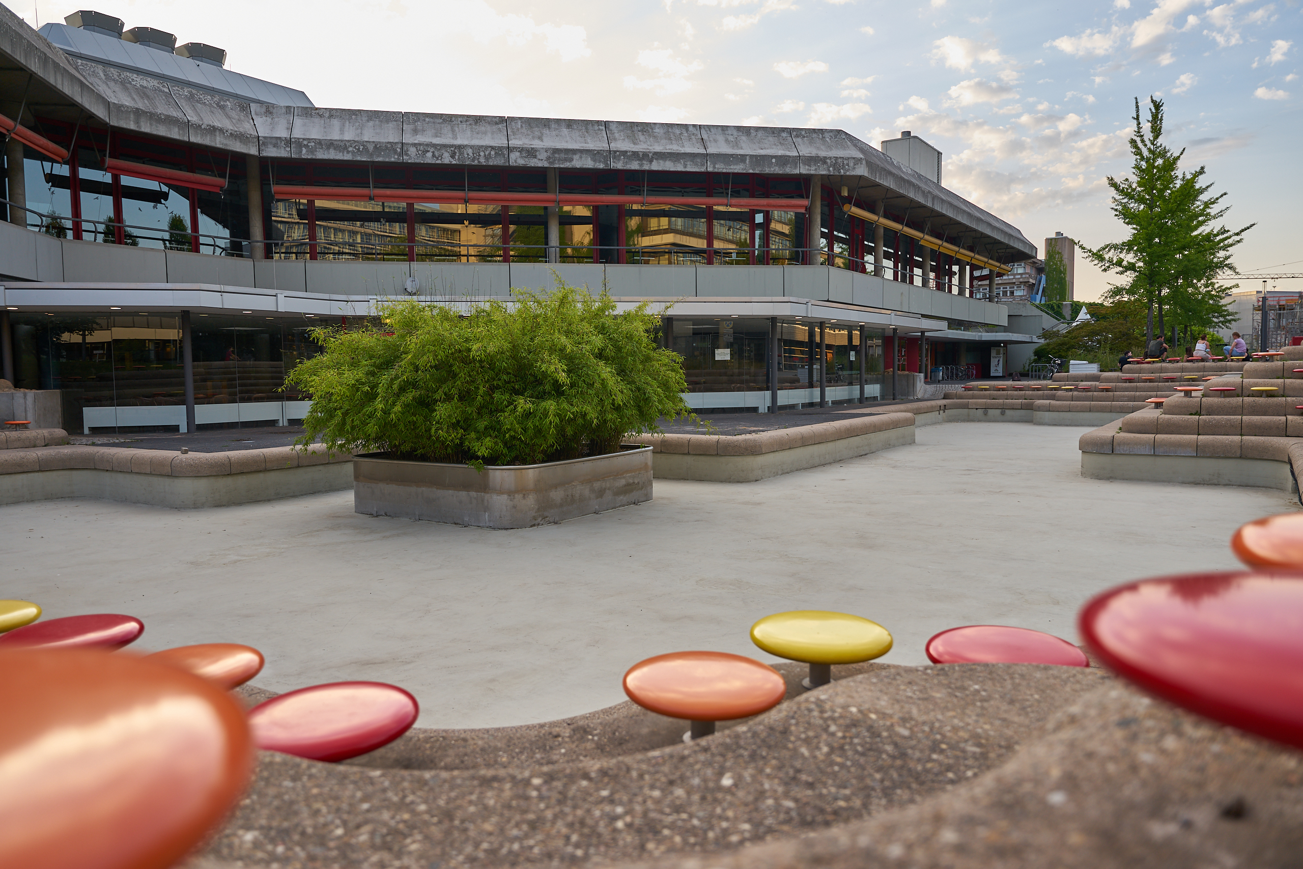 Die Steinstufen sind gekrönt von Sitzhockern aus Plastik, alle in grellen Farben, Rot, Gelb und Orange. Manche dieser Sitzgelegenheiten sind noch aufgerüstet mit einem Anschluss für Ladekabel – oder besser, scheinen es zu sein, denn sie funktionieren nicht.