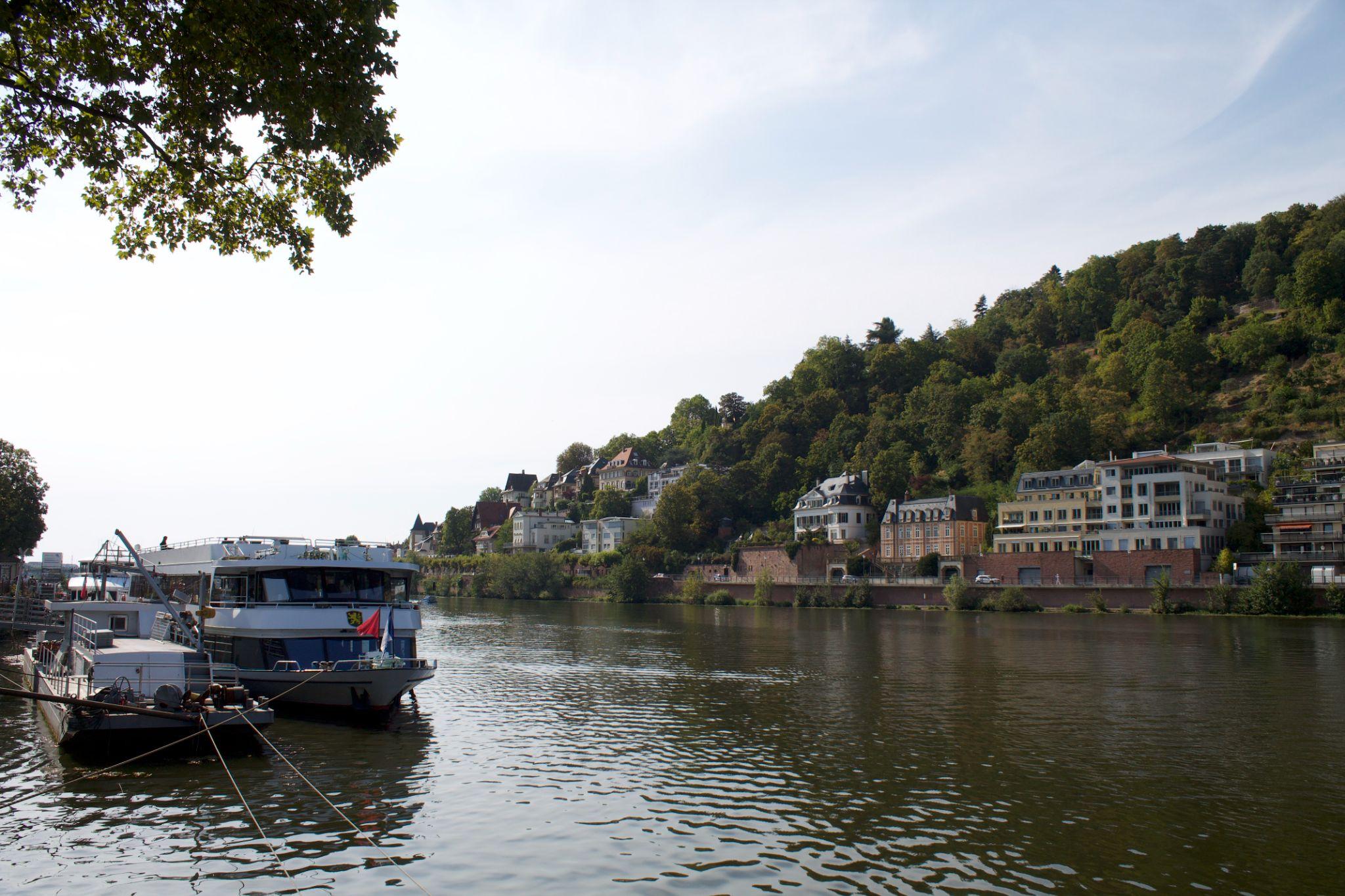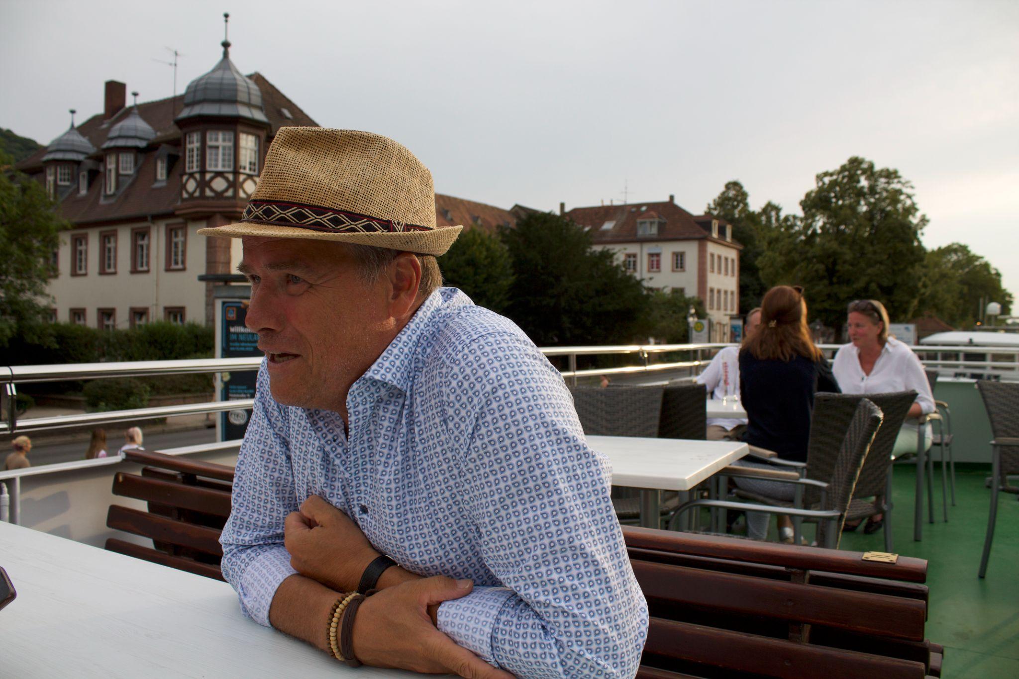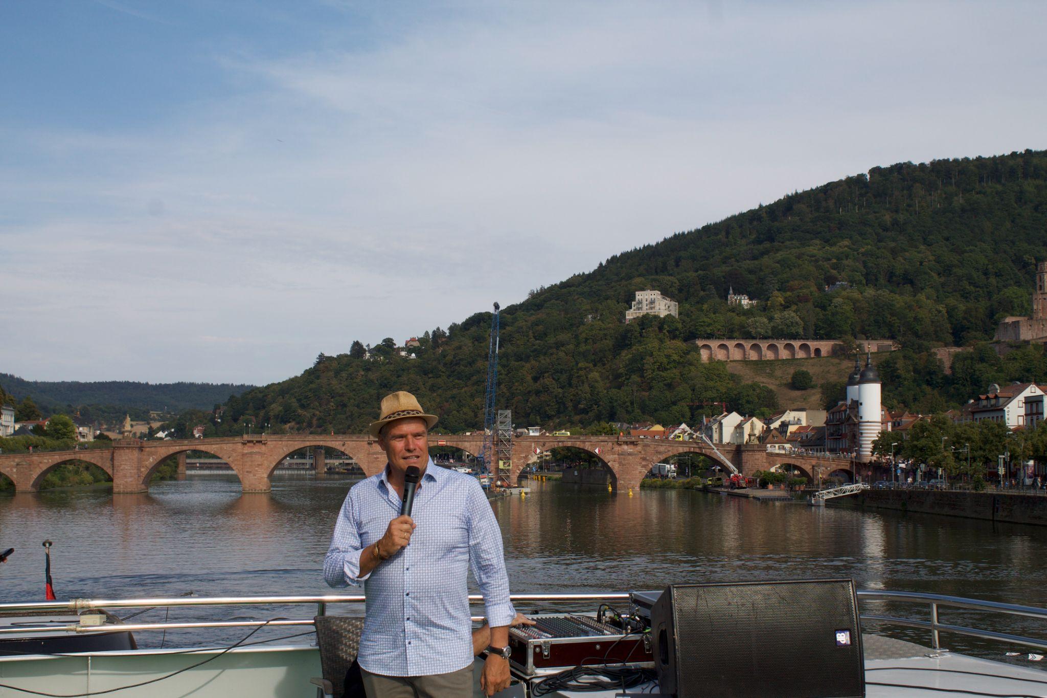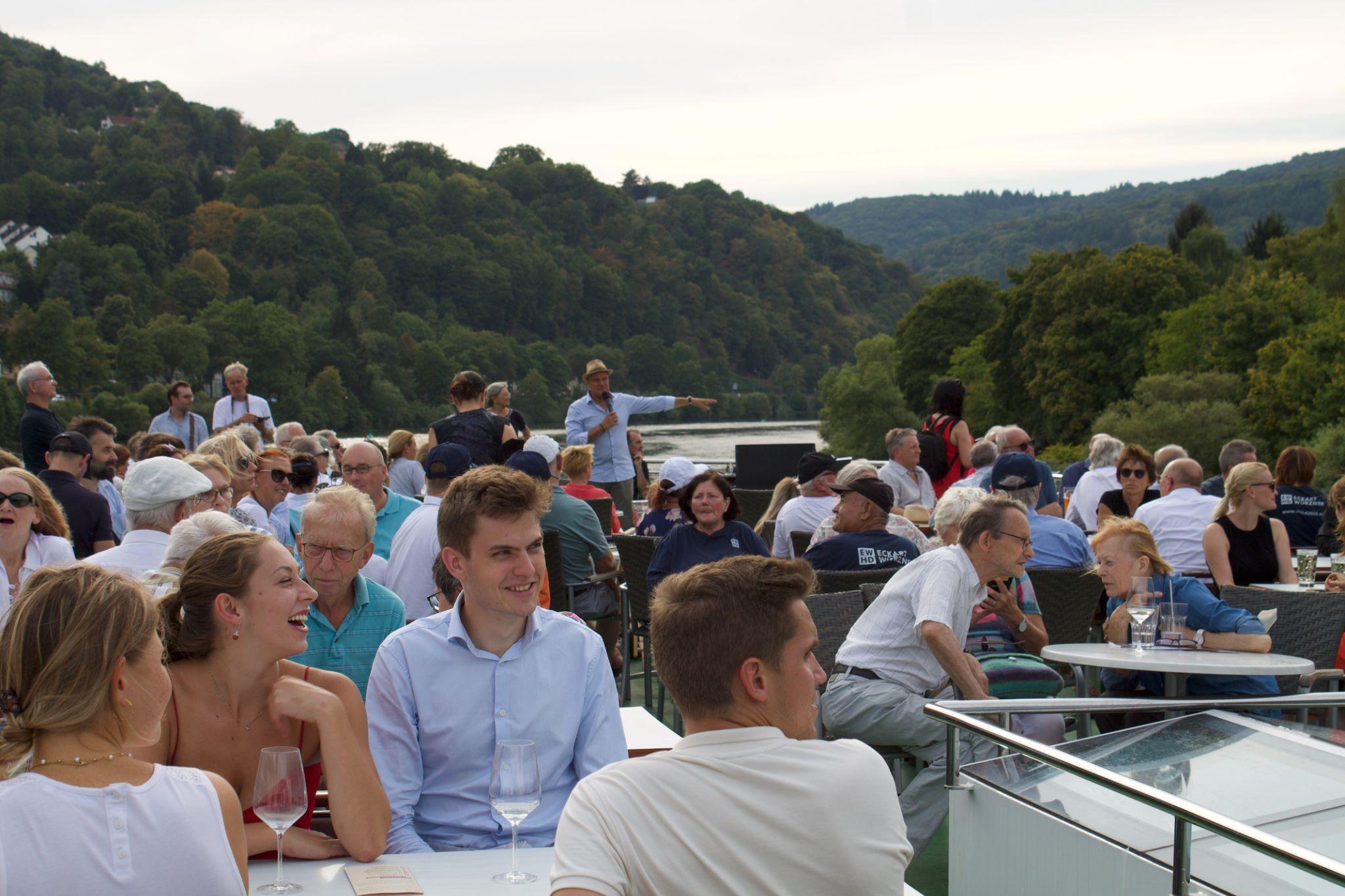 Am Pier in der Nähe des Marstalls werden alle Besucher:innen von Eckart Würzner mit einem obligatorischen Händedruck begrüßt. Uns fällt auf, dass fast alle Teilnehmenden älter als wir sind, teilweise deutlich älter, wir können aber auch einige Studierende ausmachen. Wir besteigen das Schiff und machen uns auf den Weg zum Deck, wo wir unter der prallen Sonne Platz nehmen. Langsam treffen alle dort ein, einige kaufen sich noch Getränke. Dann geht es los: Das Schiff fährt in Richtung Zoo, von dort aus nach Ziegelhausen und zurück. Würzner hält währenddessen einen etwa neunzigminütigen Vortrag. Im Anschluss sucht er das persönliche Gespräch mit den Besucher:innen.