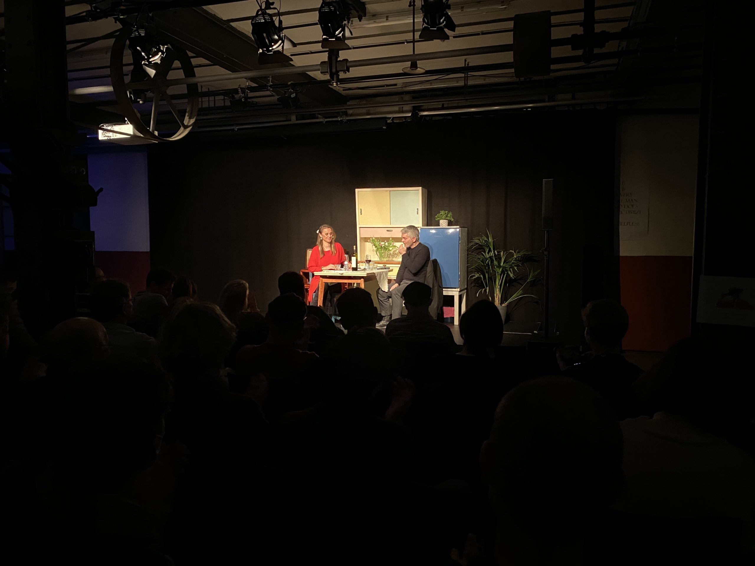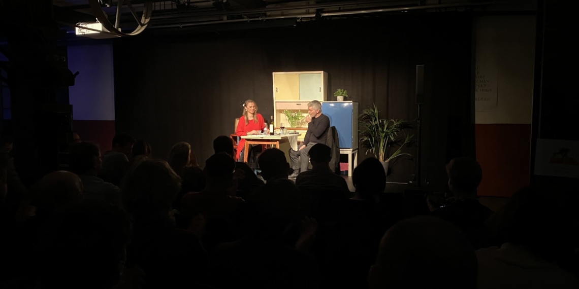 Ein alter Küchenschrank mit pastellfarbenen Türen, ein blauer Vintage-Kühlschrank, zwei blaue Stühle, ein Holztisch mit leicht angeschrägten Beinen, darauf eine kleine weiße Tischdecke, eine Flasche Rotwein und zwei Gläser: Das Bühnenbild im großen Saal des Interkulturellen Zentrums gleicht mit seiner verspielten Einrichtung einer Küche aus den 70er Jahren und steht im starken Kontrast zu den schwarz angestrichenen, eisernen Streben und Säulen des ehemaligen Industriegebäudes. Zu Gast sind heute Abend Jagoda Marinić, die Leiterin des Interkulturellen Zentrums, und Carlo Masala, Politikwissenschaftler und Professor für Internationale Politik an der Fakultät für Staats- und Sozialwissenschaften der Universität der Bundeswehr München. Dass es sich bei dem Format Talk am Tisch um ein persönliches Gespräch handelt, bei dem das Publikum „Mäuschen“ spielen darf, wird schnell deutlich: Marinić und Masala betreten die Bühne ohne Begrüßung oder Einleitung, sie setzen sich, schenken sich Rotwein ein und beginnen ihr Gespräch mitten im Thema.