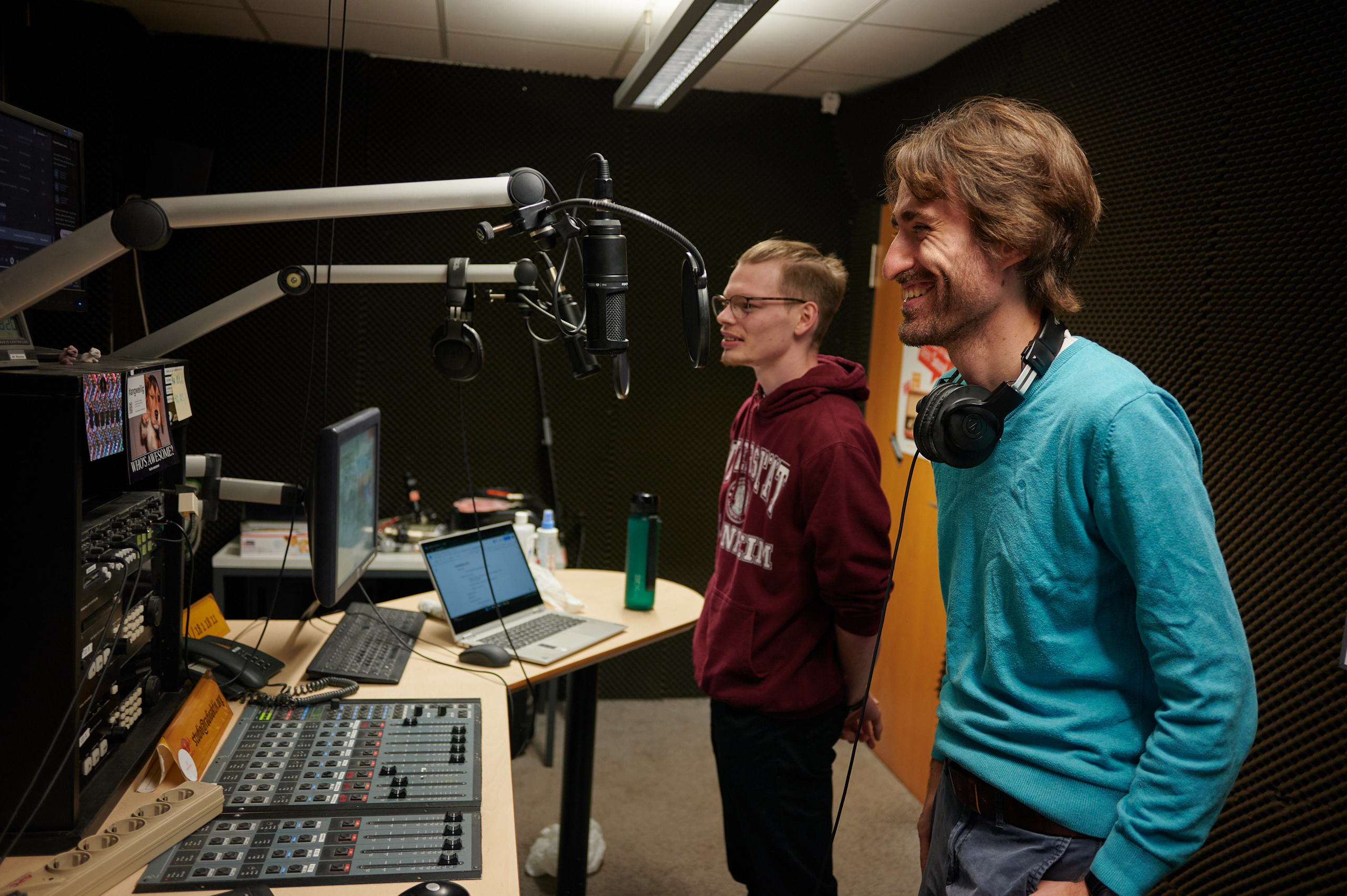 Die Wände sind mit dunkelgrauem Noppenschaum verkleidet. Bis auf das Gesagte herrscht konzentrierte Stille. Das Herzstück des Studios ist ein großer Tisch, ausgestattet mit Mikrofonen, Kopfhörern und mehreren Computern. Es ist kurz vor 18 Uhr. Raphael Zellner und Patrick Schunk werden heute die Sendung „Frei Schnauze“ moderieren: „Frei Schnauze – über alles, was momentan passiert oder auch nicht passiert“, beginnt Raphael die Sendung schließlich.