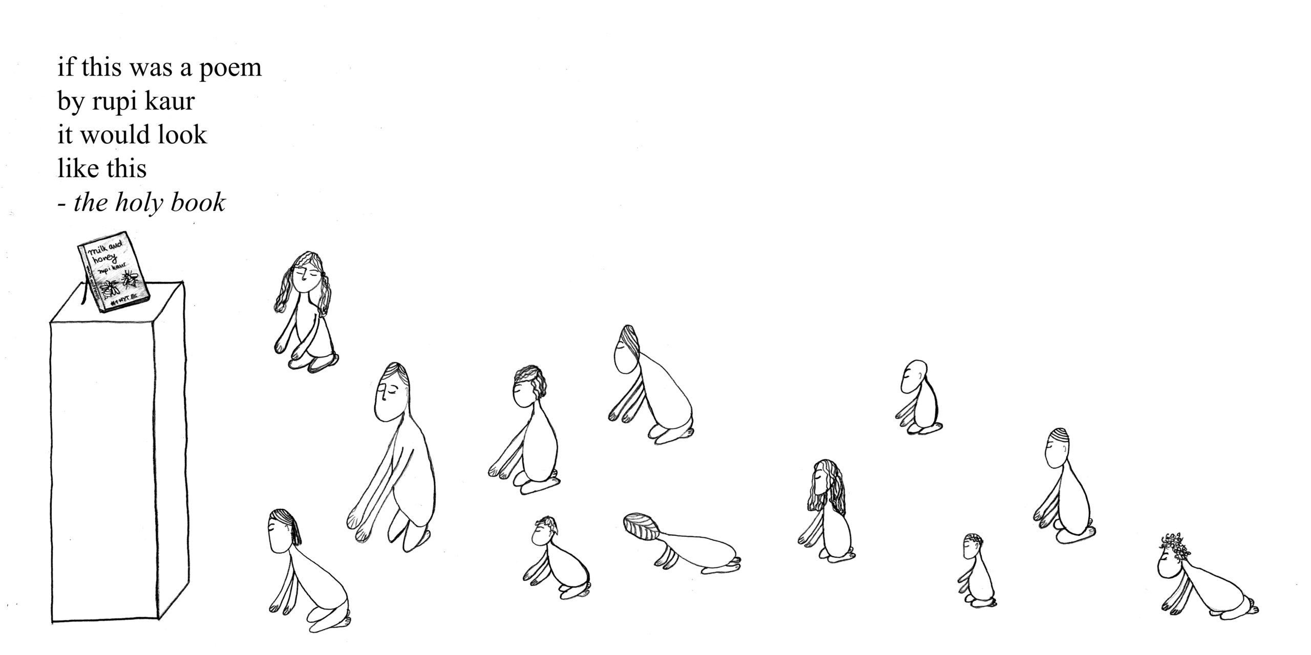 Während soziale Medien die Dolce Vita-Momente des Lebens zeigen, erzählen Kaurs Kleinbuchstaben von sexueller Gewalt, Selbstliebe und Herkunft. In ihrer Lyrik inszeniert sie sich als Leidende und Heilende zugleich. Sie ist der feministische Jesus des Instagramkults: Gelitten unter dem Patriarchat, zensiert, hinabgestiegen in das Reich der Depression, auferstanden – und so weiter. Oder in Kaurs Worten: „i’ve been hunted. killed. and walked back to earth.“