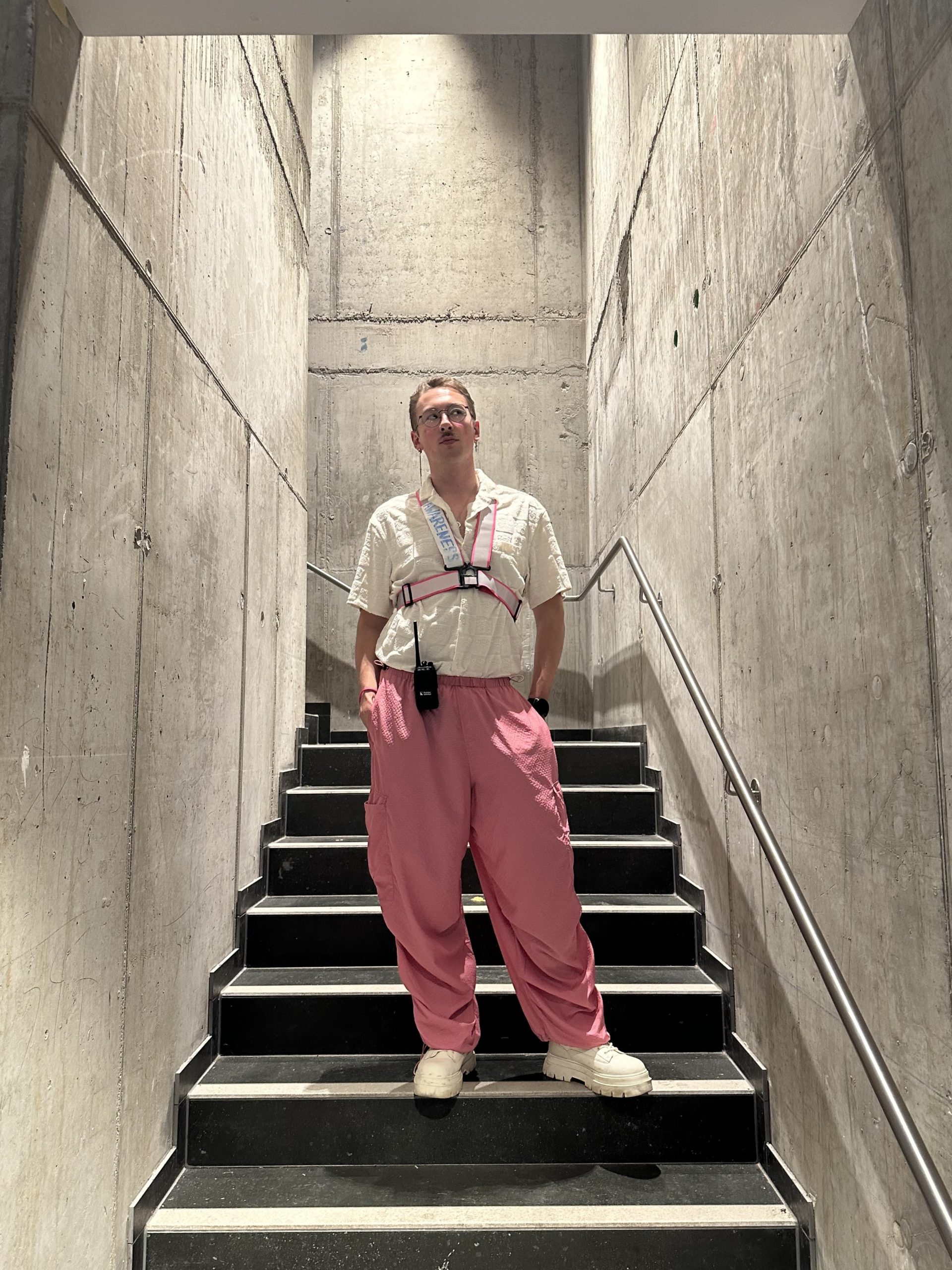 21:23 Uhr:Die letzten Sonnenstrahlen verschwinden langsam vom Marlene-Dietrich-Platz und die angenehme Abendwärme löst einen weiteren heißen Sommertag ab. Ein Mann fährt auf einem Skateboard vorbei, dann ist der Platz menschenleer. Anders im davor stehenden Karlstorbahnhof: Hier erledigt das Team flink die verbleibenden Vorbereitungen für die heutige „3000 Rave“ Party. „Das ist die Sicherheitsschürze“, erklärt Jakub mit einem Lächeln im Gesicht, während er die neonpinke Weste anlegt. Die reflektierenden Riemen zeigen in handgeschriebenen Großbuchstaben das Wort „Awareness“. Darunter trägt Jakub ein lockeres weißes Hemd und eine weite, pinke Hose. Lidstrich und Fingernägel sind farblich abgestimmt. „Ich kleide mich so, wie ich auch feiern gehen würde. Ich bin Teil dieser Feier; ein Teil der Feiernden.“ Im Gegensatz zum Security-Team, das erkennbar Autorität ausstrahlen muss, möchte Jakub sich nicht zu sehr von den Gästen abheben.