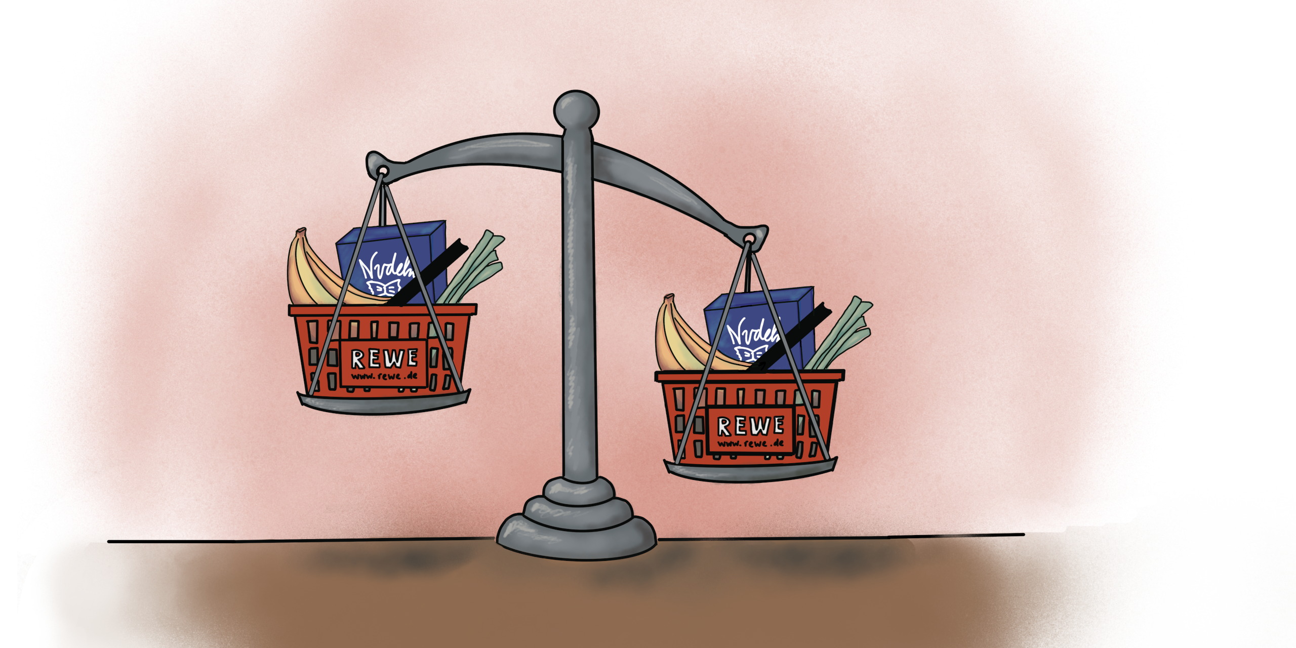 Wir machten uns also im Namen aller blanken Studis auf die Mission, herauszufinden, was für ein Spiel im Heidelberger Rewe-Kartell gespielt wird. Für das Experiment haben wir einen typischen Wocheneinkauf zusammengestellt: Er enthielt neben Grundnahrungsmitteln wie Spaghetti und Brot auch Milch, einiges an Obst und Gemüse und natürlich Snacks. Alles, was man eben braucht. Auffällig: Von 23 ausgewählten Artikeln kosten 22 im Mathematikon-Rewe mehr als im Rewe in Kirchheim. Lediglich der Alsan-Butterersatz hat in beiden Märkten denselben Preis. Die meisten Lebensmittel haben einen Aufpreis von mindestens 30 Cent.