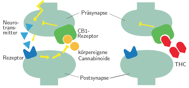 Zwischen zwei Nervenzellen findet elektrische und chemische Signalübertragung von der Senderzelle (Präsynapse) zur Empfängerzelle (Postsynapse) statt. An der präsynaptischen Seite der Nervenzellen kommen in verschiedenen Regionen des Körpers sogenannte CB1 Rezeptoren vor. Diese gehören zum Endocannabinoidsystem.